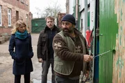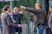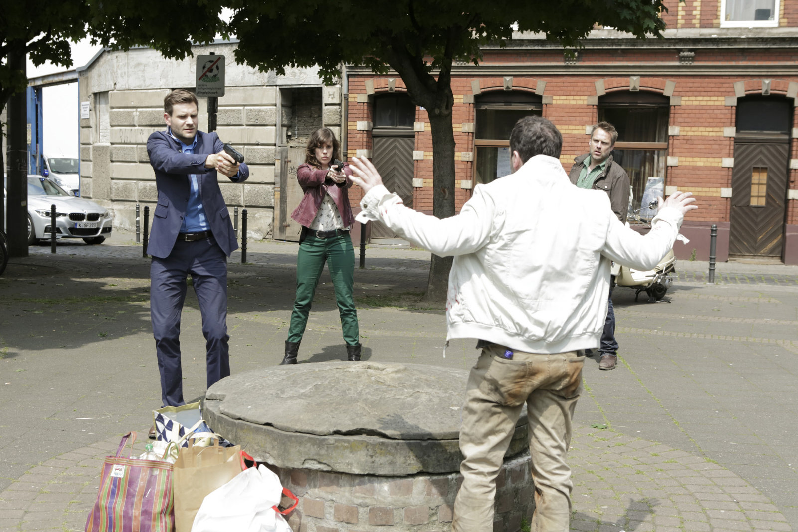VatertagAuf der Suche nach dem Amokläufer Rainald Kosing stellen Matti Wagner (Pierre Besson, re.), Jonas Fischer (Lukas Piloty, li.) und Sophia Mückeberg (Anne Schäfer) einen Verdächtigen in einer hellen, blutverschmierten Jacke. Aber leider: Fehlanzeige! Die Jacke hat der Mann (Komparse) aus einem Mülleimer gefischt...Kosing ist weiterhin flüchtig.Bild: © ZDF und Michael Böhme