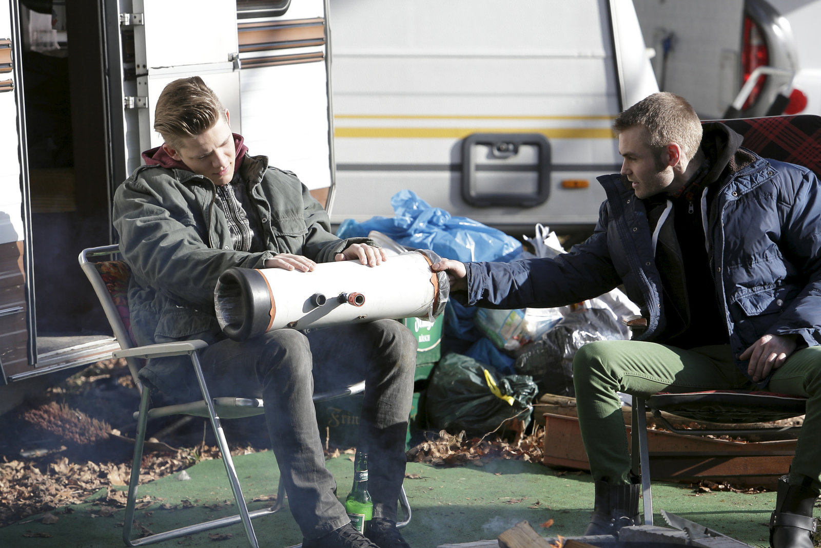 Die Gunst der Stunde3.000 Euro für eine einzelne Lieferung Hengstsperma - Dressurwunder Ringo ist seinen Preis wert! Nico Löscher (Julian Paeth, re.) und Thorsten Opoczynski (Max von der Groeben, li.) wittern ihre große Chance, schnell an Geld zu kommen, und planen den nächtlichen Samenraub.Bild: © ZDF und Michael Böhme
