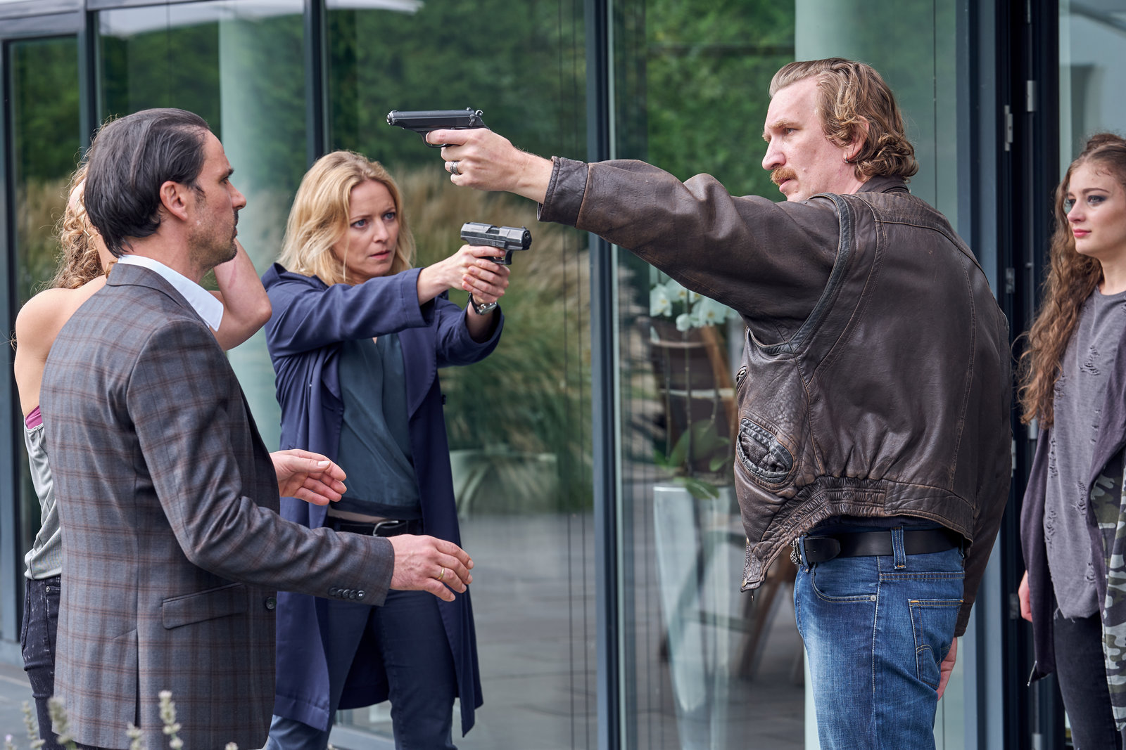MonsterDas SOKO-Team im vollen Einsatz: Kann Kommissarin Anna Maiwald (Diana Staehly, 3.v.l.) einen weiteren Mord verhindern? Und warum bedroht Daniel Gellert (Karsten Antonio Mielke, 2.v.r.) seinen alten Freund Volker Schilling (Sascha Göpel, l.) vor den Augen seiner Frau Nicole (Alessija Lause, 2.v.l.) und Tochter Maja (Rosmarie Röse, r.) mit einer Waffe?Bild: © ZDF und Frank Dicks