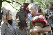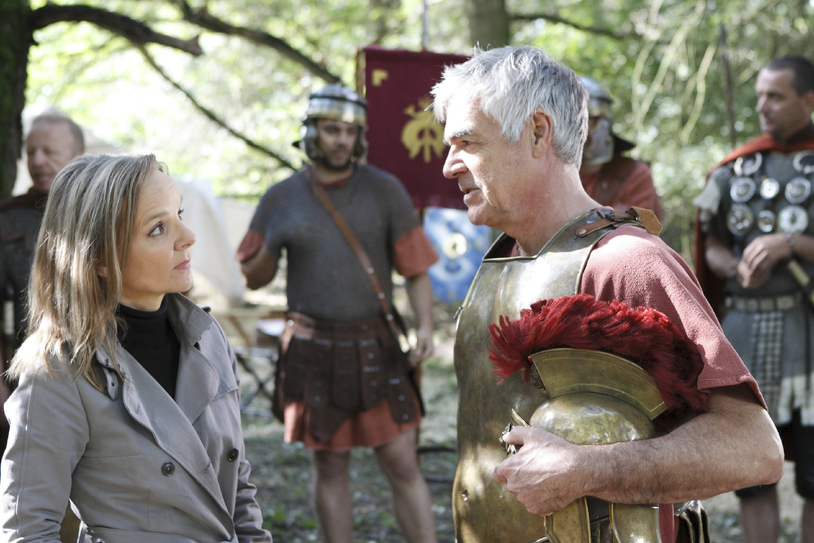 Die Römer von BocklemündDer Freizeitrömer Armin Sattler (Michael Greiling, v) weiß auf Karin Reuters (Sissy Höfferer) Fragen keine Antworten. Er kann sich nicht vorstellen, dass der Mörder aus seiner "Legion" stammt. Darsteller im Hintergrund = Komparsen.Bild: © S1