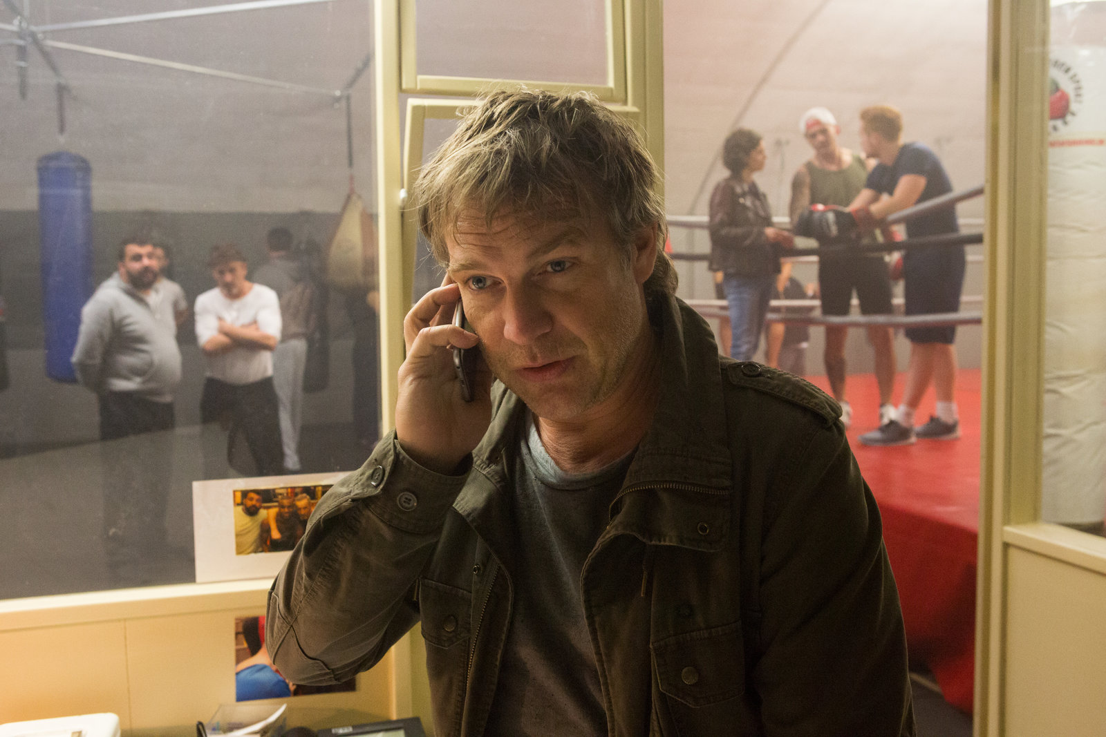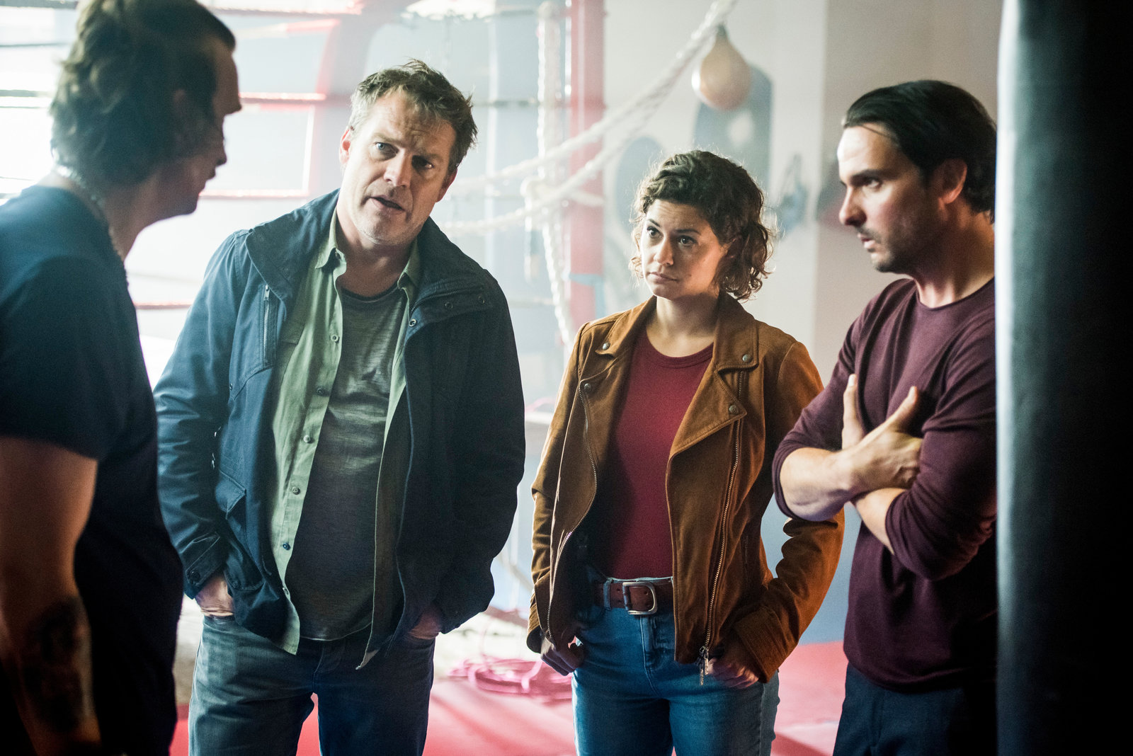 Schwere JungsKommissar Matti Wagner (Pierre Besson, M.) schaut sich im Boxclub der Mordverdächtigen, Hakan Kerimoglu (Sahin Eryilmaz, hinten l.) und Rudi Engelland (Tim Wilde, hinten 2.v.l.), um. Finden er und seine Kollegin Lilly Funke (Tatjana Kästel, hinten 3.v.l.) hilfreiche Beweise und mögliche Zeugen?Bild: © ZDF und Michael Böhme