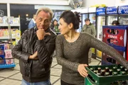 Bickendorfer BüdchenErry Stoklosa (Erry Stoklosa, l.) macht gegenüber der Büdchenbesitzerin Lissy Schönen (Siir Eloglu) keinen Hehl daraus, dass er deren Lebensgefährten Jochen Klepper (Peter Harting, rechts hinter Lissy stehend) nicht ausstehen kann. Immer wieder macht er ihr kleine Geschenke. Will er am Ende mehr von der attraktiven Frau?Bild: © ZDF und Michael Böhme