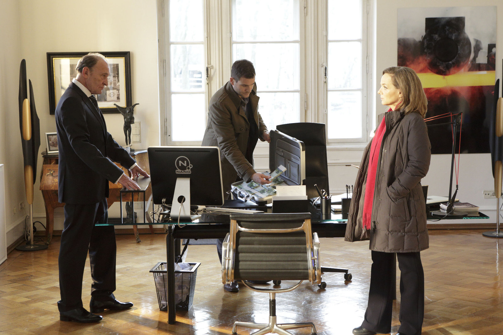 Der große Wurfv.l.: Günther Reimann (Michael Mendl), Jonas Fischer (Lukas Piloty), Karin Reuter (Sissy Höfferer)Bild: © ZDF und ZDF / Michael Boehme