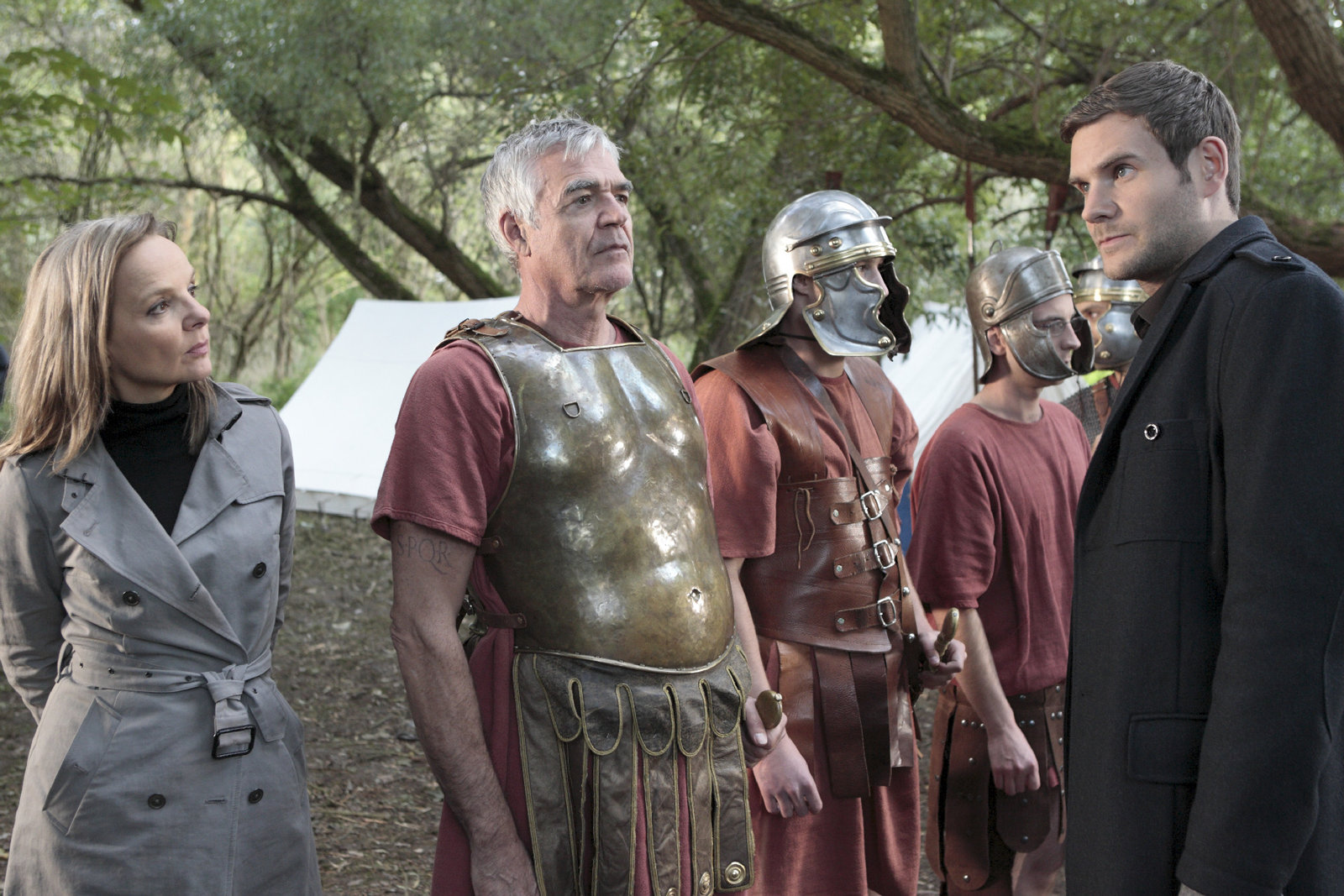 Die Römer von BocklemündKarin Reuter (Sissy Höfferer) und ihr Kollege Jonas Fischer (Lukas Piloty, r) schreiten die "Ehren"legion der Freizeitrömer ab. Der Chef der Truppe Armin Sattler (Michael Greiling, l) hat offensichtlich etwas zu verbergen. (Bruno Madea (Sebastian Weber, 2.v.l.) Reiner Sattler (Michael Krabbe, 3.v.l.) )Bild: © S1