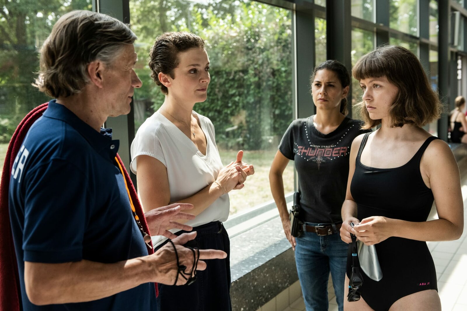 AbsackerKommissarin Lilly Funke (Tatjana Kästel, 2.v.r.) ermittelt im Umfeld des ermordeten Schwimmtrainers. Die ehrgeizige Mutter Tatjana Grund (Karoline Bär, 2.v.l.) machte das Opfer für eine Verletzung ihrer Tochter Johanna (Antonia Breidenbach, r.) verantwortlich. Ein Kommentar der jungen Schwimmerin gegenüber dem Vorgänger des Opfers, Michael Reinbach (Stephan Baumecker, l.), lässt Lilly aufhorchen.Bild: © ZDF und MARTIN_VALENTIN_MENKE.