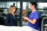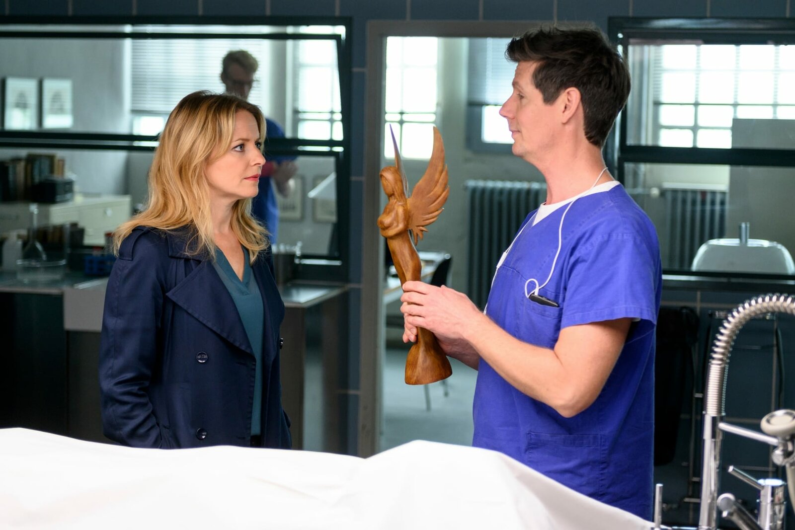 LiebesengelDas Opfer wurde mit einem hölzernen „Liebesengel“ erschlagen. Pathologe Dr. Kraft (Thomas Clemens, r.) erklärt Hauptkommissarin Anna Maiwald (Diana Staehly, l.) den möglichen Tathergang.Bild: © Sat.1 Emotions