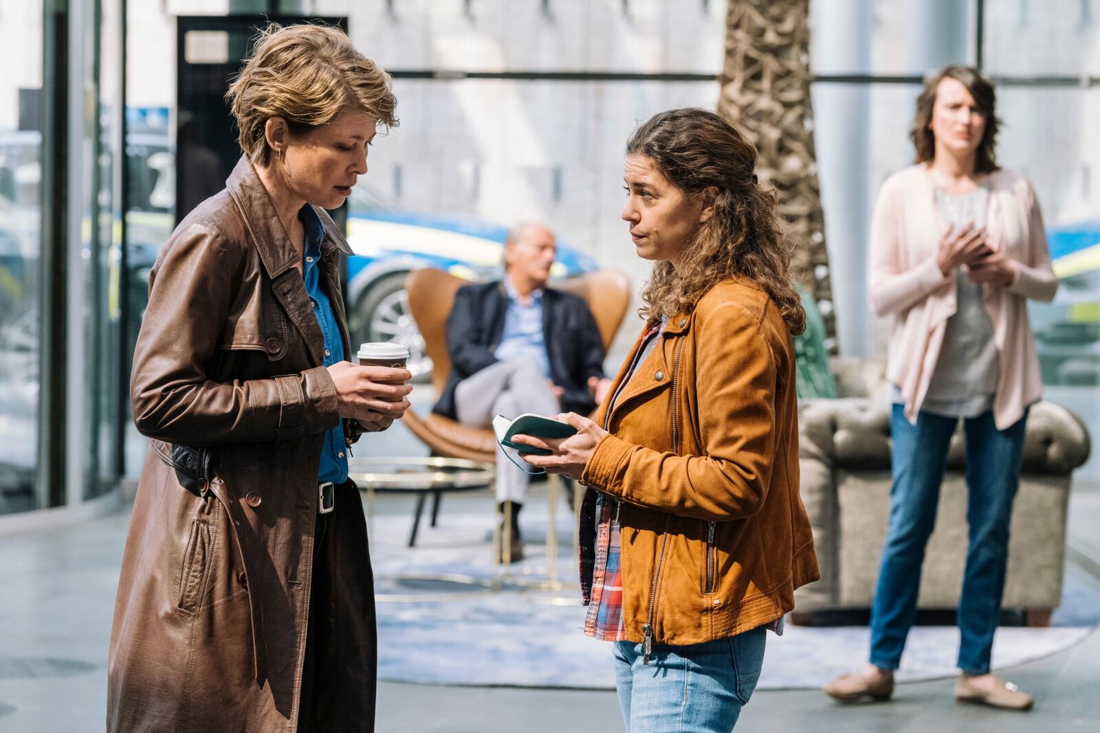 ErlösungLilly Funke (Tatjana Kästel, 2.v.r.) berichtet Hauptkommissarin Helena Jung (Sonja Baum, l.), dass die tote Hotelangestellte von einem Gast gefunden worden ist. War Kaja Crameris (Laura Sundermann, r.) Freund, der vorbestraft ist, wirklich nur zur falschen Zeit am falschen Ort?Bild: © ZDF und Martin Rottenkolber.