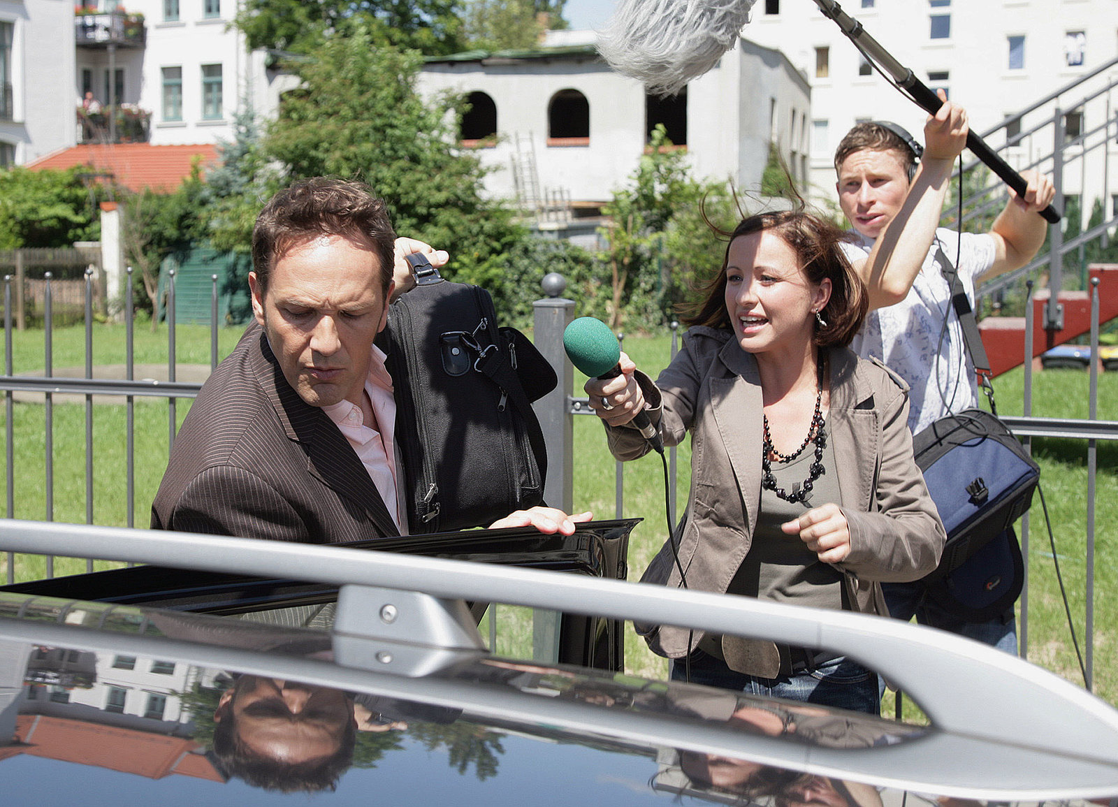 PrivatsacheAufmerksamkeit der Medien: Max Gertsch als Helmut Thiel, Friederike Lippold al seine ReporterinBild: © Copyright SRF/ZDF/Uwe Frauendorf