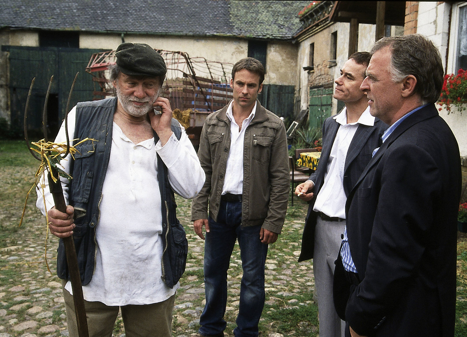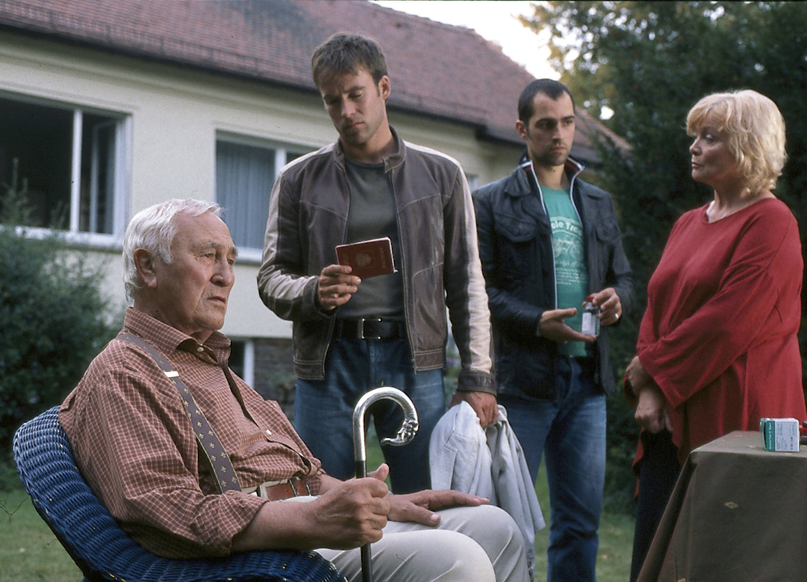 Im Schatten des AdlersBefragung: Ryszard Wojtyllo als Bauer Sedlacek, Marco Girnth als Kriminaloberkommissar Jan Maybach, Janusz Cichocki als Kommisar Nemec,Andreas Schmidt-Schaller als Hauptkommissar Hajo TrautzschkeBild: © SRF/ZDF /Uwe Frauendorf