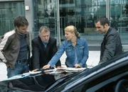 CallgirlGeschäftliche Beziehung zum Mordopfer: Marco Girnth als Kriminaloberkommissar Jan Maybach, Matthias Deutelmoser als Hanns Neubert, Rainer Laupichler als Kollege Elsing, Andreas Schmidt-Schaller als Hauptkommissar Hajo TrautzschkeBild: © SRF/ZDF/Uwe Frauendorf