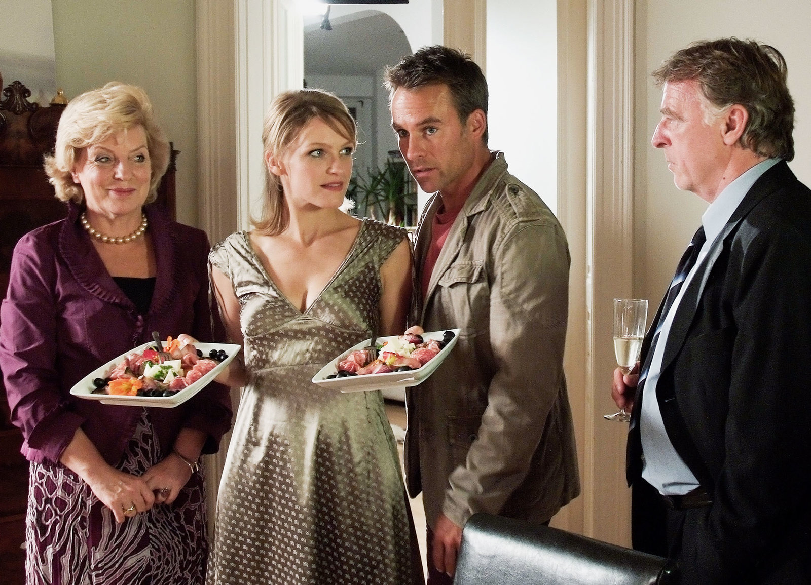 Der große AugenblickFamilienzusammenführung: Peggy Lukac als Jans Mutter, Caroline Scholze als Leni, Marco Girnth als Kriminaloberkommissar Jan Maybach, Andreas Schmidt-Schaller als Hauptkommissar Hajo TrautzschkeBild: © SRF/ZDF /Uwe Frauendorf