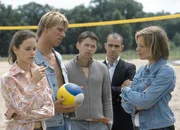 NervenkitzelBefragung: Anja Knauer als Lea, Volker Büdts als Nic, Andreas Arnstedt als Sven, Gabriel Merz als Kriminalkommissar Miguel Alvarez, Melanie Marschke als Kriminaloberkommissarin Ina ZimmermannBild: © SRF/ZDF /Uwe Frauendorf
