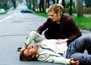 IrrwegeVerwundet: Marco Girnth als Kriminaloberkommissar Jan Maybach, Melanie Marschke als Kriminaloberkommissarin Ina ZimmermannBild: © SRF/ZDF/Uwe Frauendorf