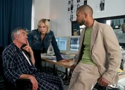 Happy EndBefragung des Opfer des Mordanschlages : Michael Greiling als Frank Latour, Melanie Marschke als Kriminaloberkommissarin Ina Zimmermann, Tyron Ricketts als Kriminalkommissar Patrick GrimmBild: © SRF/ZDF /Uwe Frauendorf