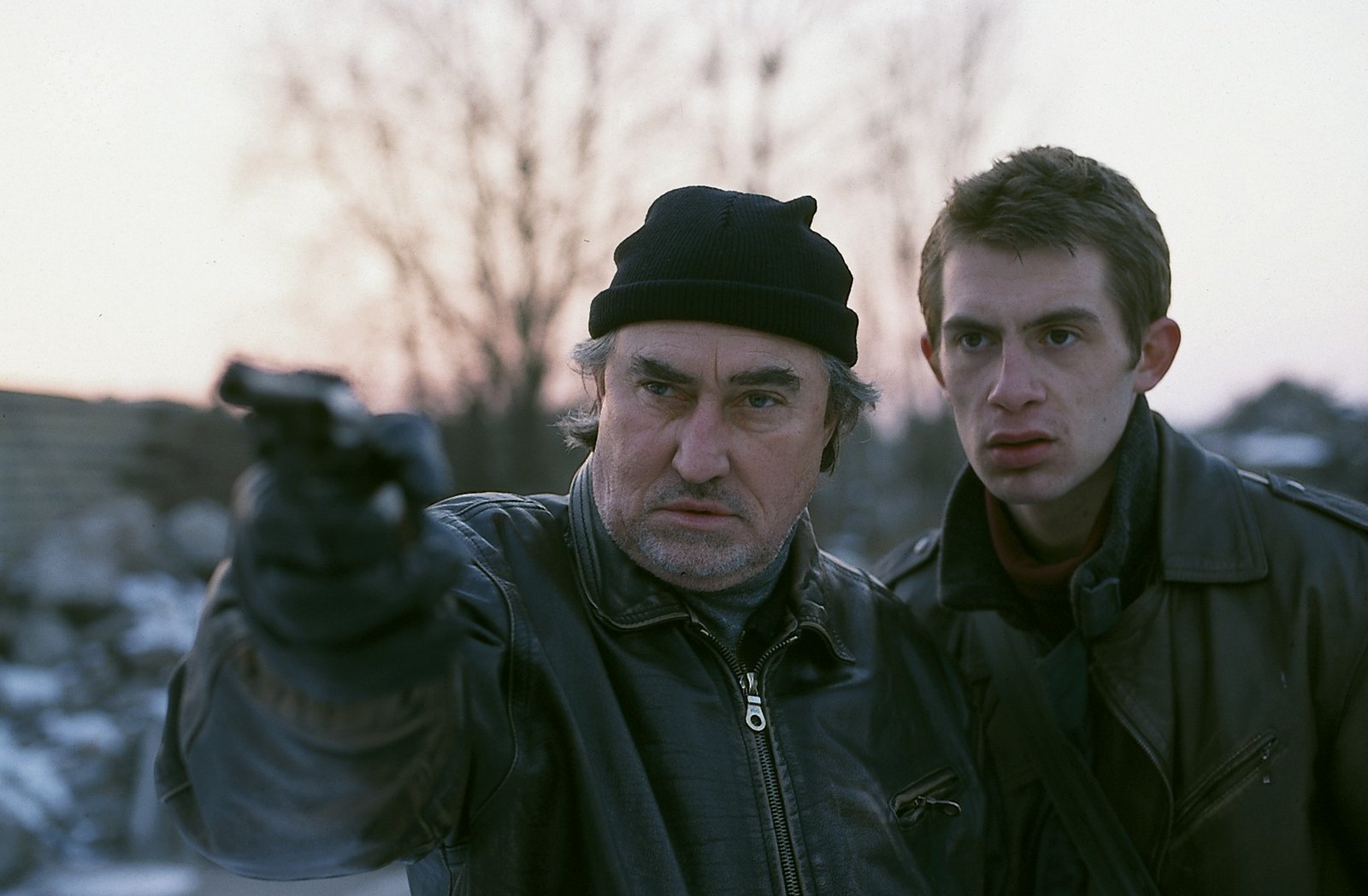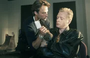 Tödliche Falle2. Hans Gasser (Nicolas Lansky, l.) und Ralf Mende (Aaron Hildebrand, r.) werden bei einem Geldraub auf frischer Tat ertappt. Eiskalt zieht Gasser die Pistole.Bild: © Uwe Frauendorf