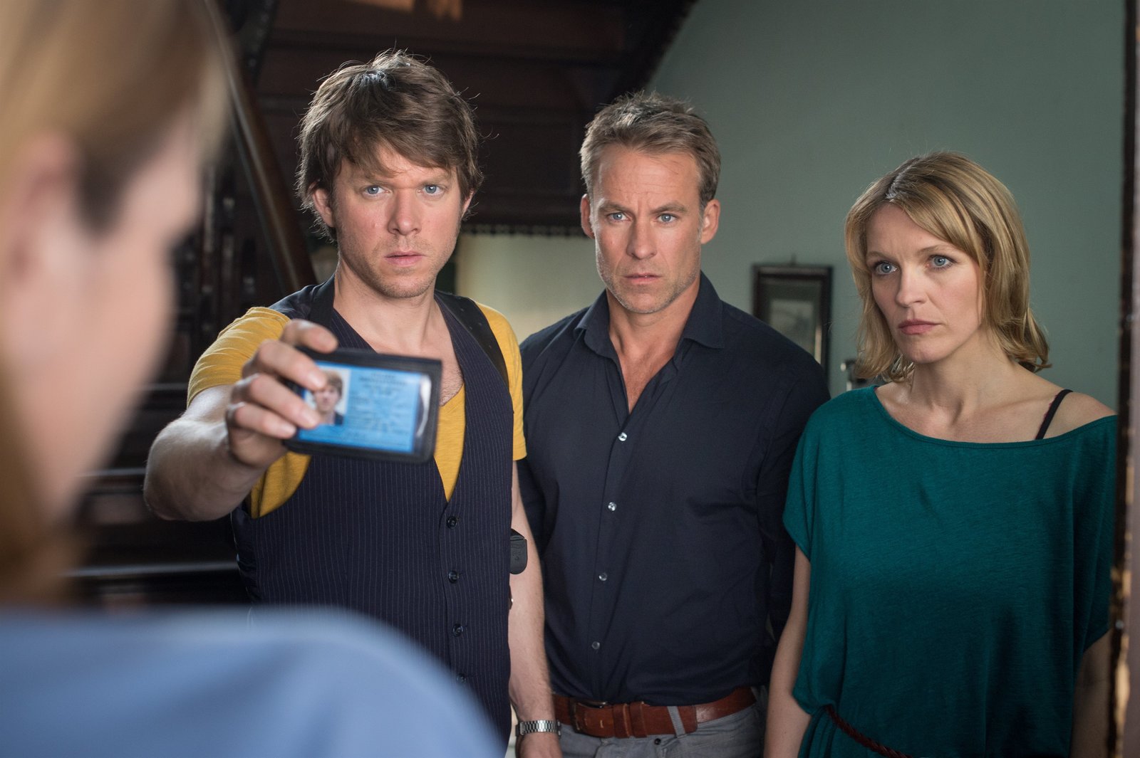 Die MoorleicheHajo Trautzschke (Andreas Schmidt-Schaller, M) und Ina Zimmermann (Melanie Marschke, l.) befragen Jessica Bohrer (Christina Große, r.), die Frau eines Verdächtigen. Warum deckt sie ihren Mann, obwohl er sie erkennbar brutal misshandelt?Bild: © ZDF und Uwe Frauendorf