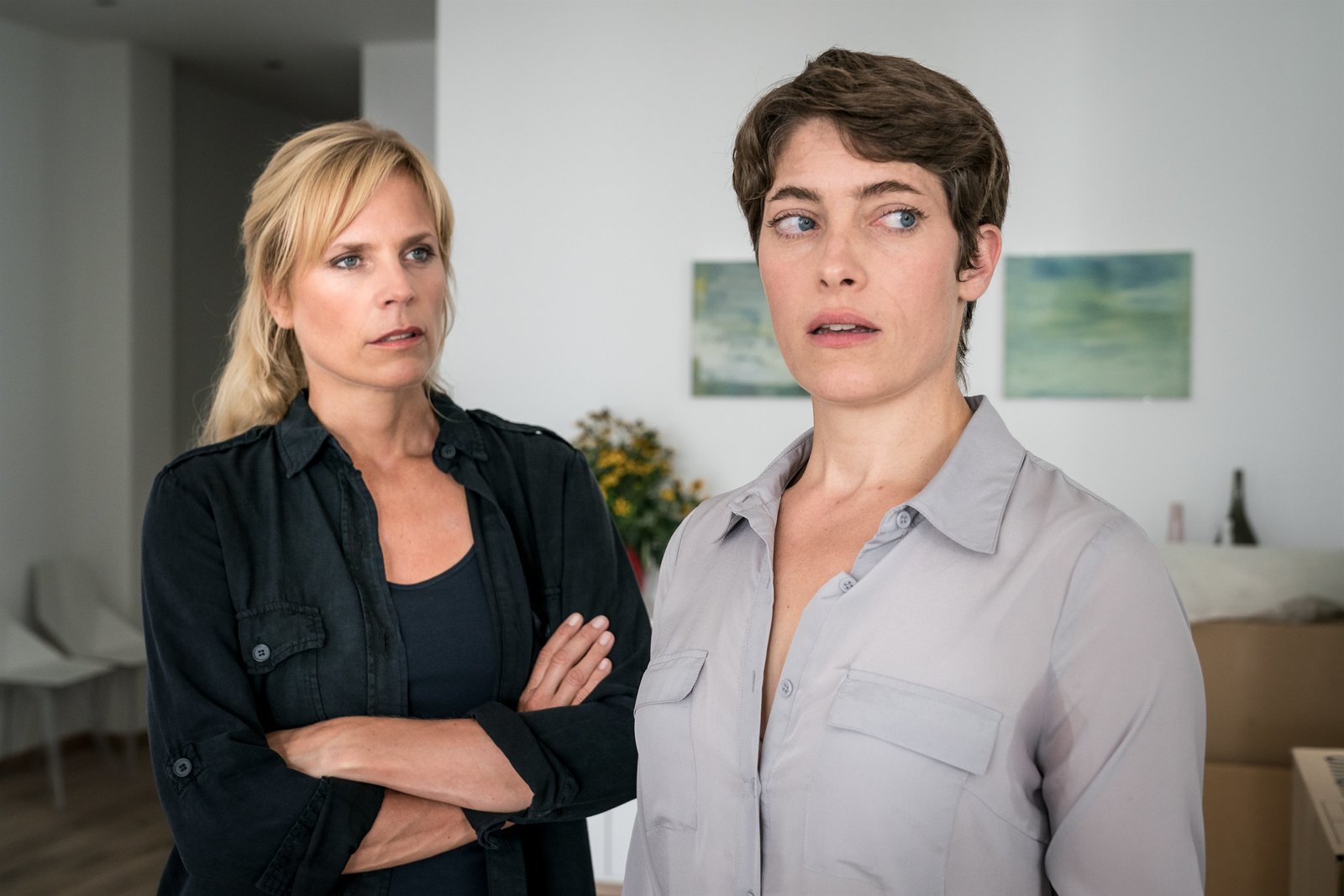 Crash1. Ina (Melanie Marschke, r.) kümmert sich um Julia Winter (Katrin Weißer, l.), die ihren Freund erschlagen in seiner Wohnung gefunden hat.Bild: © Uwe Frauendorf