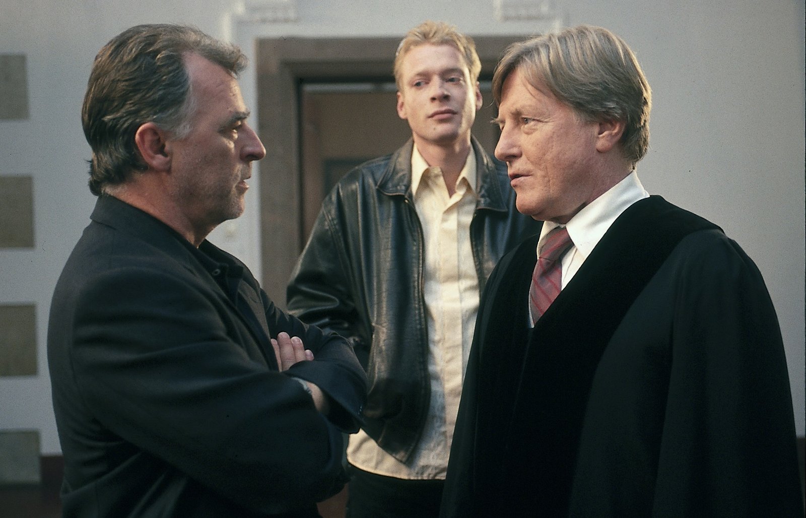 Das Duell2. Zwischen Hajo (Andreas Schmidt-Schaller, li.) und Dr. Schäfer (Manfred Zapatka, re.) entwickelt sich regelrecht ein Duell, bei dem es dem Anwalt immer wieder gelingt, für seinen Mandanten Ingo Meier (Stefan Kaminsky, Mi.) Löcher in der Beweiskette zu finden.Bild: © Uwe Frauendorf