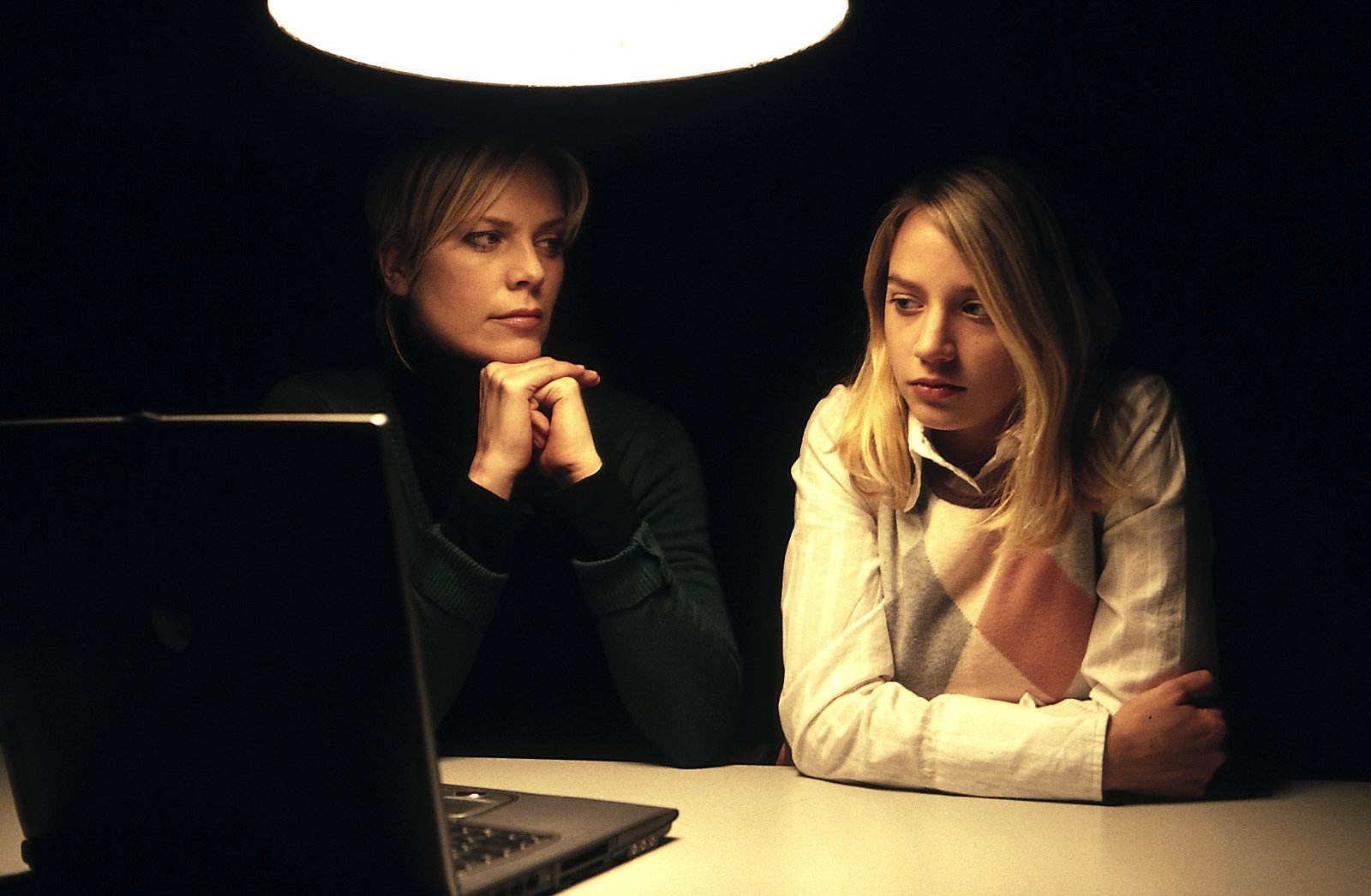 Preis der WahrheitDie Abschlussfeier der Abiturienten wurde gefilmt. Ina (Melanie Marschke, l.) versucht mit Hilfe dieser Aufnahme herauszubekommen, warum Anja Winzer (Jytte-Merle Böhrensen, r.) die Annahme ihres Zeugnisses verweigerte und Lehrern und Eltern Verlogenheit vorwarf.Bild: © ZDF und Uwe Frauendorf
