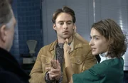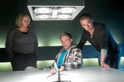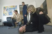Die blinde ZeuginDie neue Pathologin Dr. Conradi (Margrit Sartorius, l.) demonstriert an Jan (Marco Girnth, Mi.), wie der Täter die Pistole gehalten haben muss.Bild: © Uwe Frauendorf