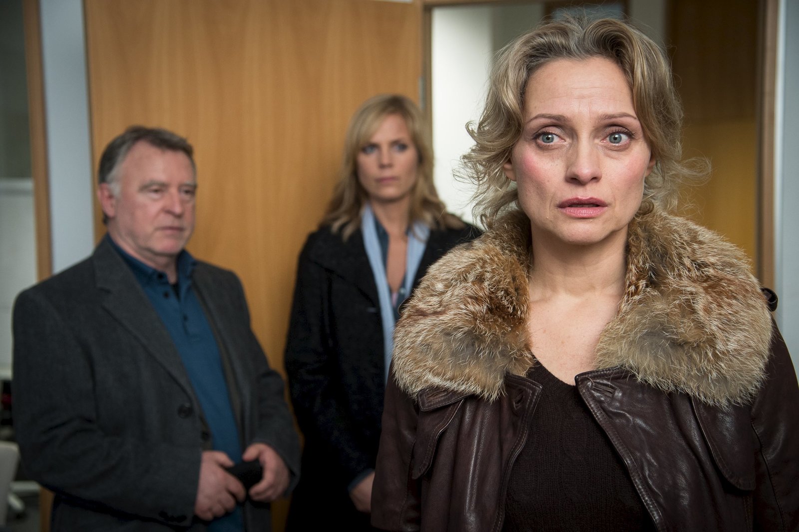 Wir sind nicht alleinMarianne Neumann (Catherine Flemming, r.) kann nicht glauben, dass ihre Tochter tot ist. Ina (Melanie Marschke, M.) und Hajo (Andreas Schmidt-Schaller, l.) mussten den Neumanns die traurige Nachricht überbringen.Bild: © ZDF und Uwe Frauendorf