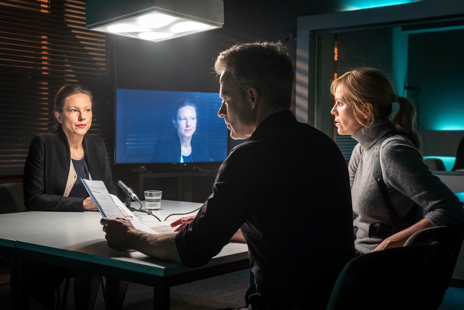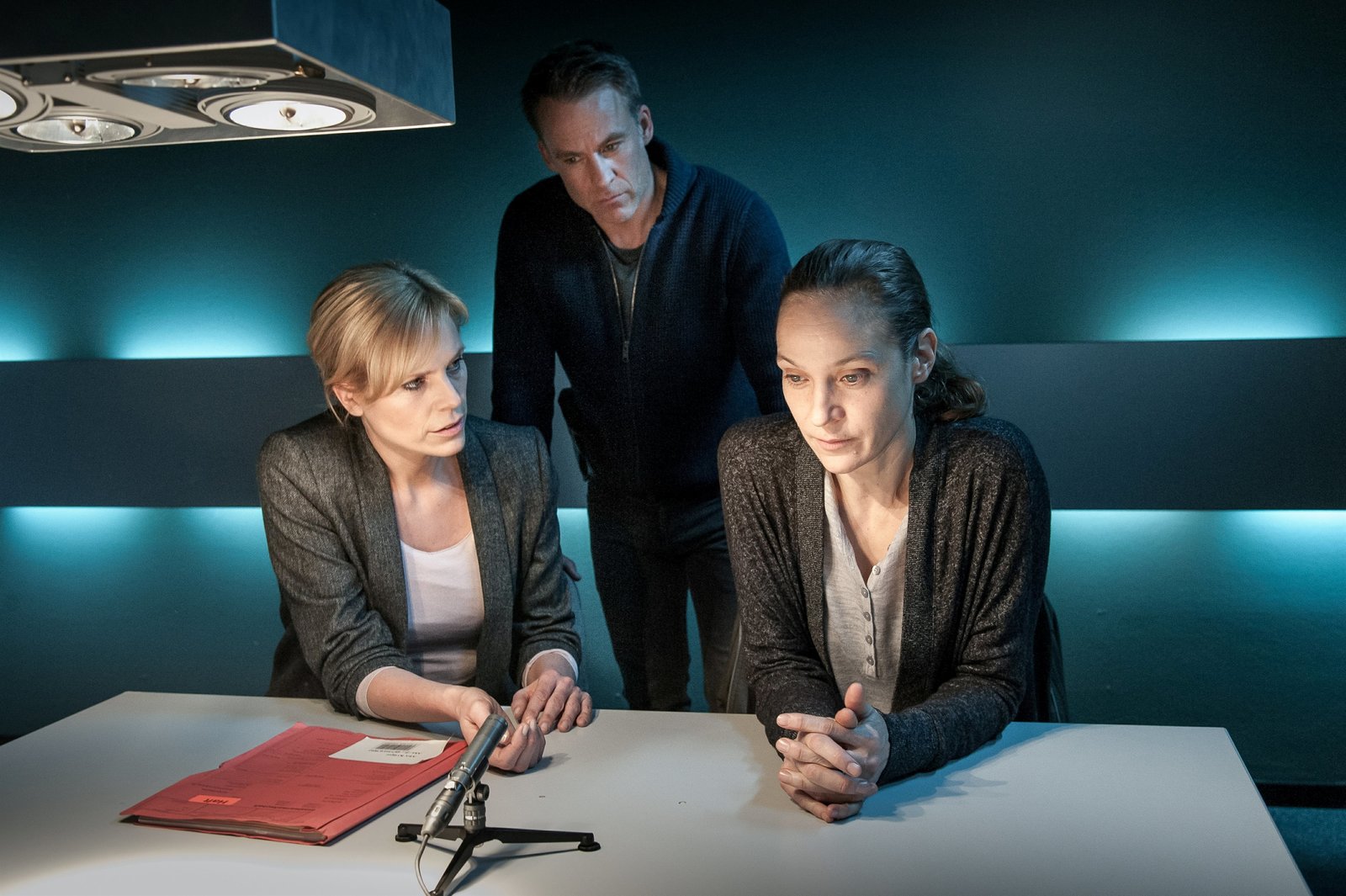 Dunkle TriadeMagdalena Blomberg (Susanne Hoss, l.) berichtet Jan Maybach (Marco Girnth, M.) und Ina Zimmermann (Melanie Marschke, r.), wie sich damals ihrer Entführung ihrer Kinder zugetragen hat.Bild: © ZDF und Uwe Frauendorf.