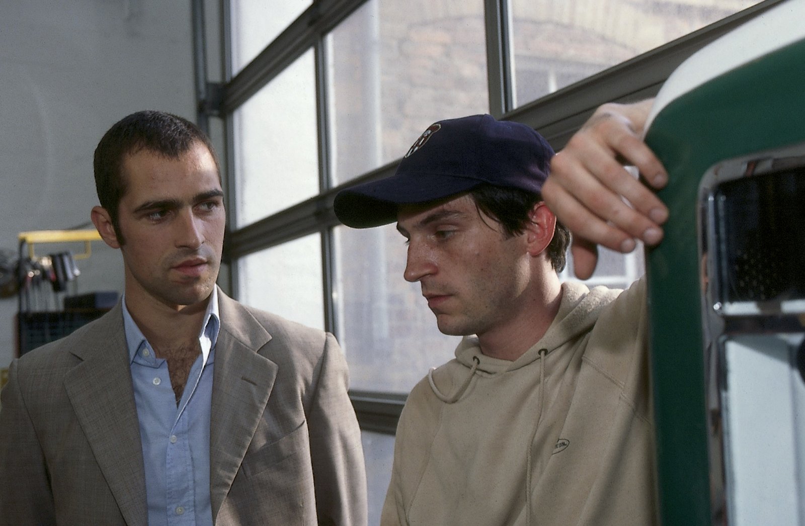 CrashMiguel (Gabriel Merz, l.) befragt den Automechaniker Mario Menzel (Christoph Bach, r.).Bild: © Uwe Frauendorf