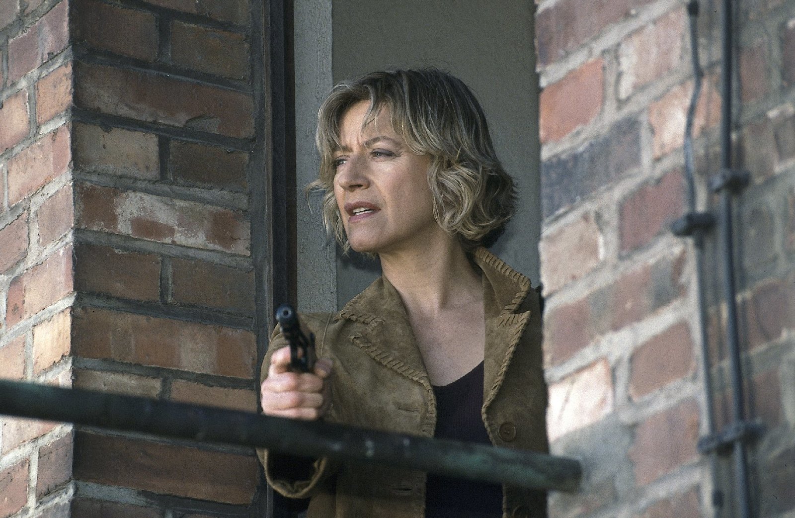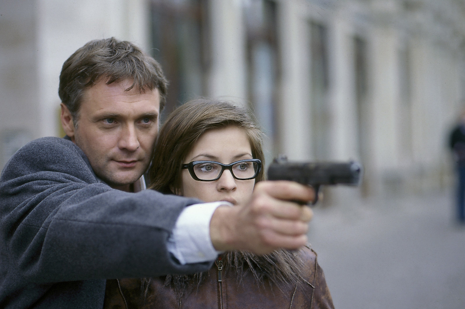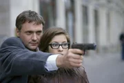 Auf der FluchtBei einem Lokaltermin nimmt der Bankräuber Wolfgang Bongartz (Bernhard Schir, l.) die Praktikantin der SOKO, Swenja Birkholz (Loretta Stern, r.) als Geisel.Bild: © ZDF und Uwe Frauendorf