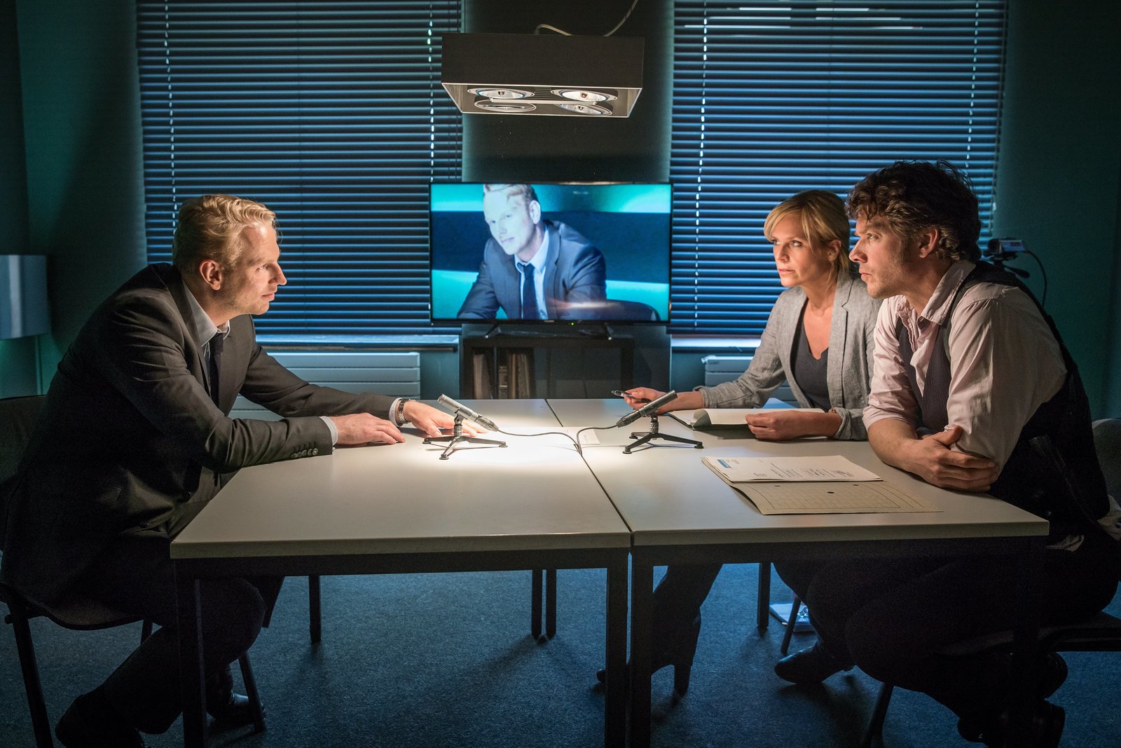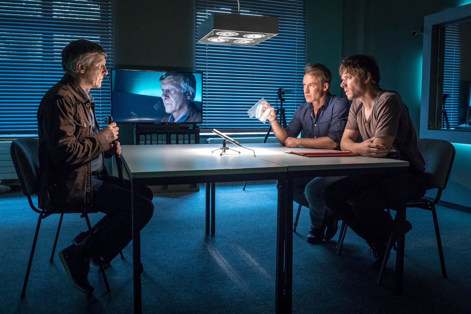 SchatzsucheHajo (Andreas Schmidt-Schaller, l.) und Jan (Marco Girnth, M.) vernehmen Frank Holzer (Patrick von Blume, r.) der unter Verdacht steht, seine Kinder entführt zu haben.Bild: © ZDF und Uwe Frauendorf