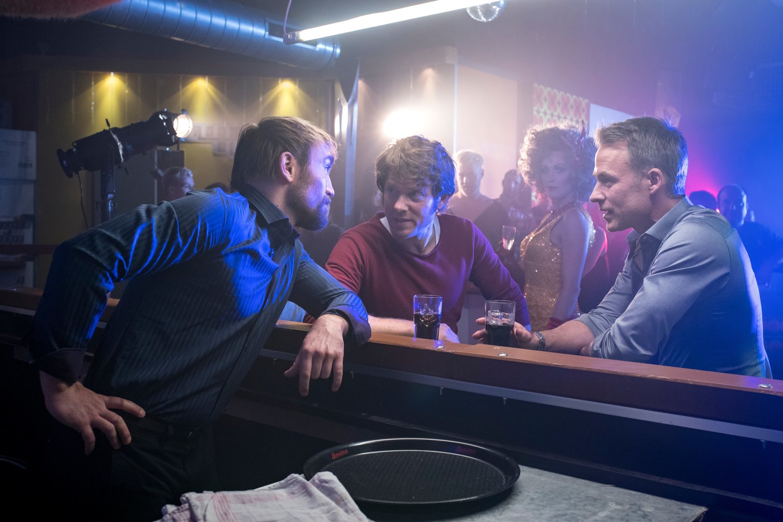 Der SchattenmannTom Kowalski (Steffen Schroeder, M.) und Jan Maybach (Marco Girnth, r.) ermitteln undercover in einem Schwulenclub und bitten den Barkeeper (Philipp Oehme, l.), ihre Tarnung nicht auffliegen zu lassen.Bild: © ZDF und Uwe Frauendorf.