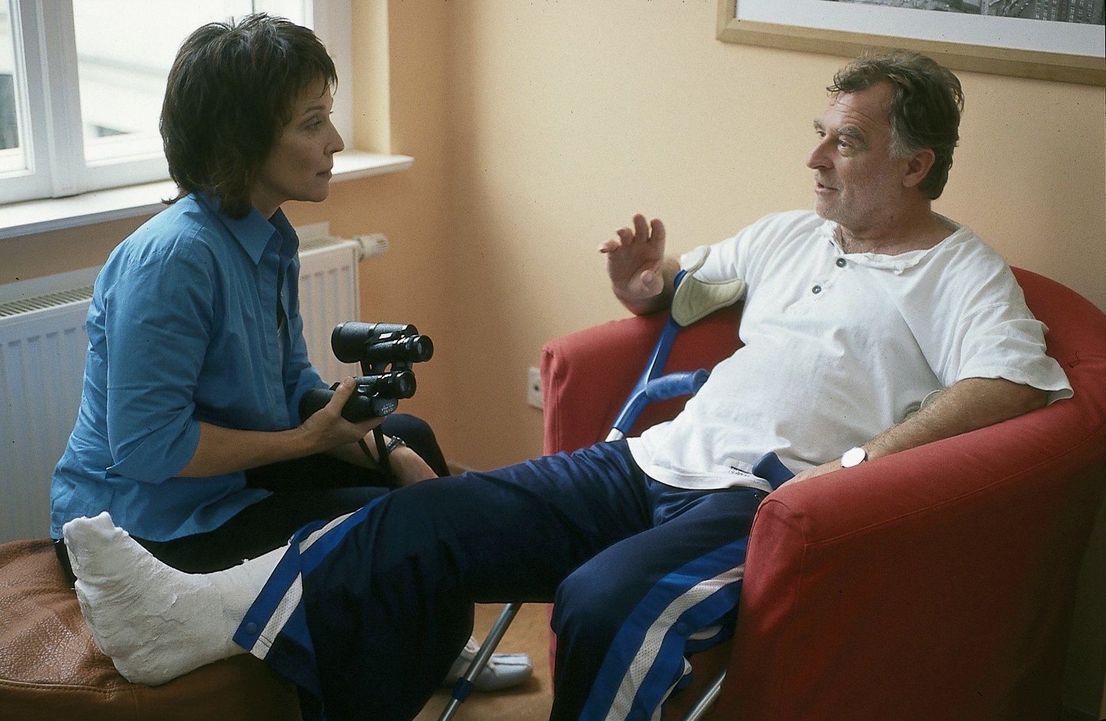 Gute NachbarnBei einem Einsatz hat sich Hauptkommissar Hajo Trautzschke (Andreas Schmidt-Schaller, r.) das Bein gebrochen. Die Physiotherapeutin Eleonore (Eva Kryll, l.) kümmert sich um ihn.Bild: © Uwe Frauendorf
