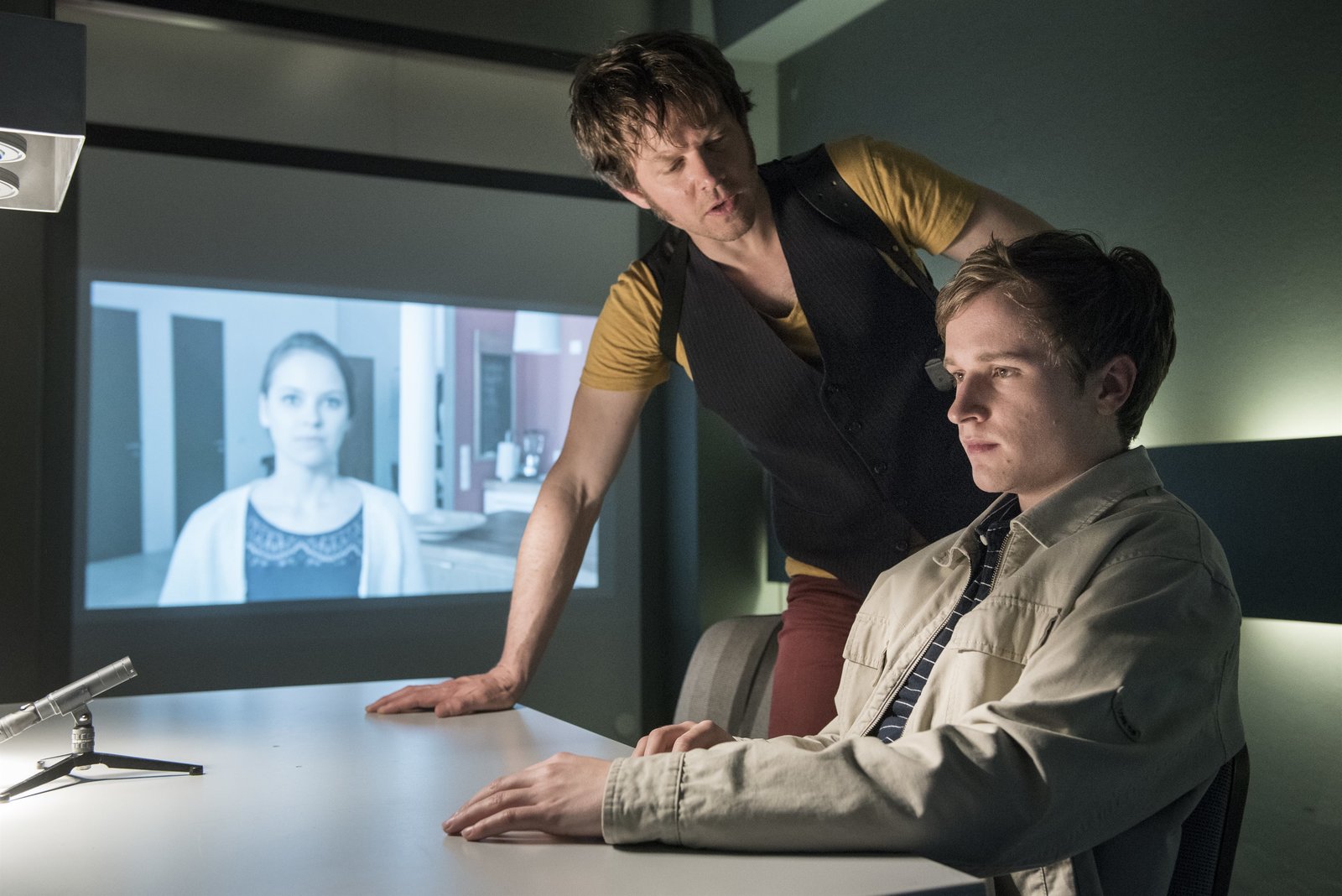 Online-GirlTom Kowalski (Steffen Schroeder, l.) will von Dominik Schröder (Anton von Lucke, r.), dem Freund des toten Mädchens (Barbara Prakopenka, im Hintergrund) wissen, ob es einen Beziehungsstreit gab.Bild: © ZDF und Uwe Frauendorf./Uwe Frauendorf