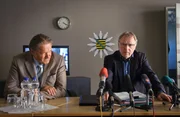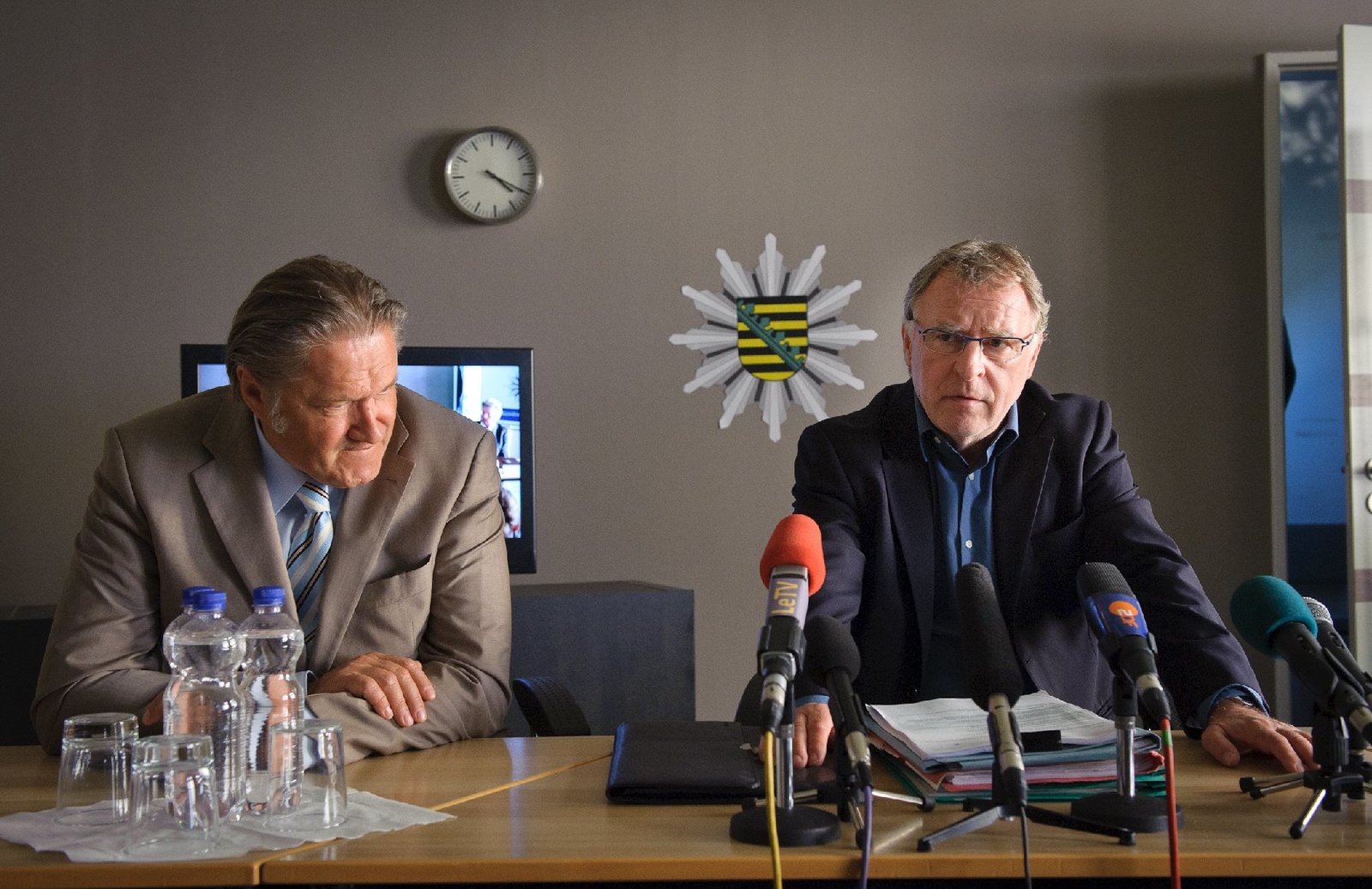 ClearWoernle (Michael Brandner, l.) und Hajo (Andreas Schmidt-Schaller, r.) auf einer Pressekonferenz. Hajo teilt den Journalisten das Ergebnis der Ermittlungen im Mordfall eines Scientologen mit.Bild: © SRF zwei