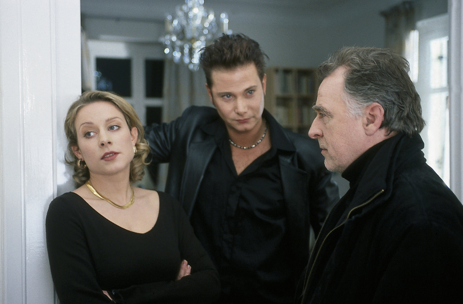 NotwehrHajo Trautzschke (Andreas Schmidt-Schaller, r.) befragt die Witwe, Rita Weidenfels (Natalie O'Hara, l.) und den Bruder des Toten, Tobias Weidenfels (Fabian Harloff, M.) nach dem Tathergang.Bild: © ZDF und Uwe Frauendorf