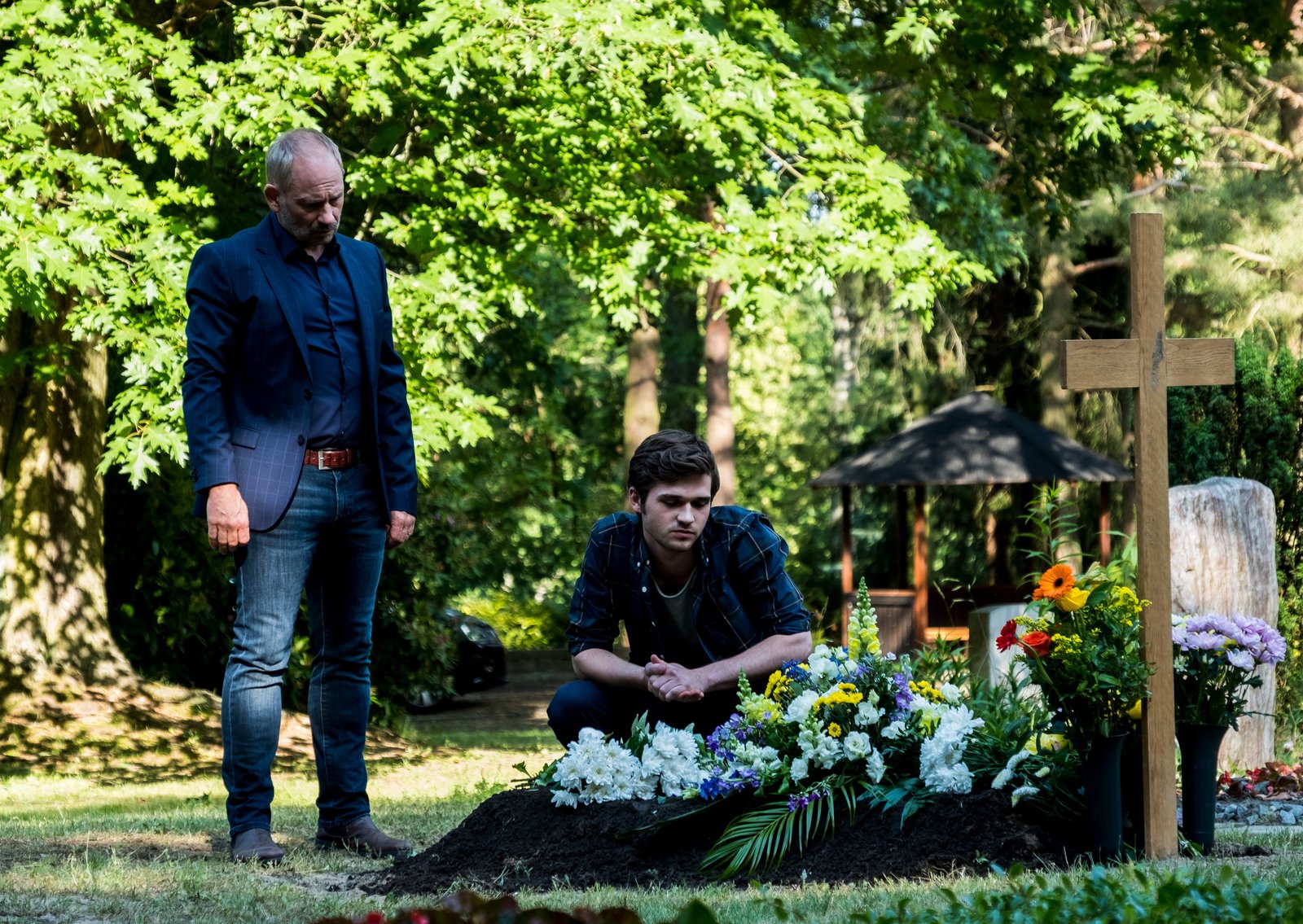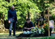 Verlorene SöhneBernhard Henschel (Michael Lott, l.) und sein Sohn Max (Henry Horn, r.) haben das Grab von Max' bestem Freund gefunden. Sie hoffen, dass der mutmaßliche Mörder bald auf dem Friedhof auftauchen wird.Bild: © ZDF und © ZDF/Bantry Bay/Gordon Muehle.