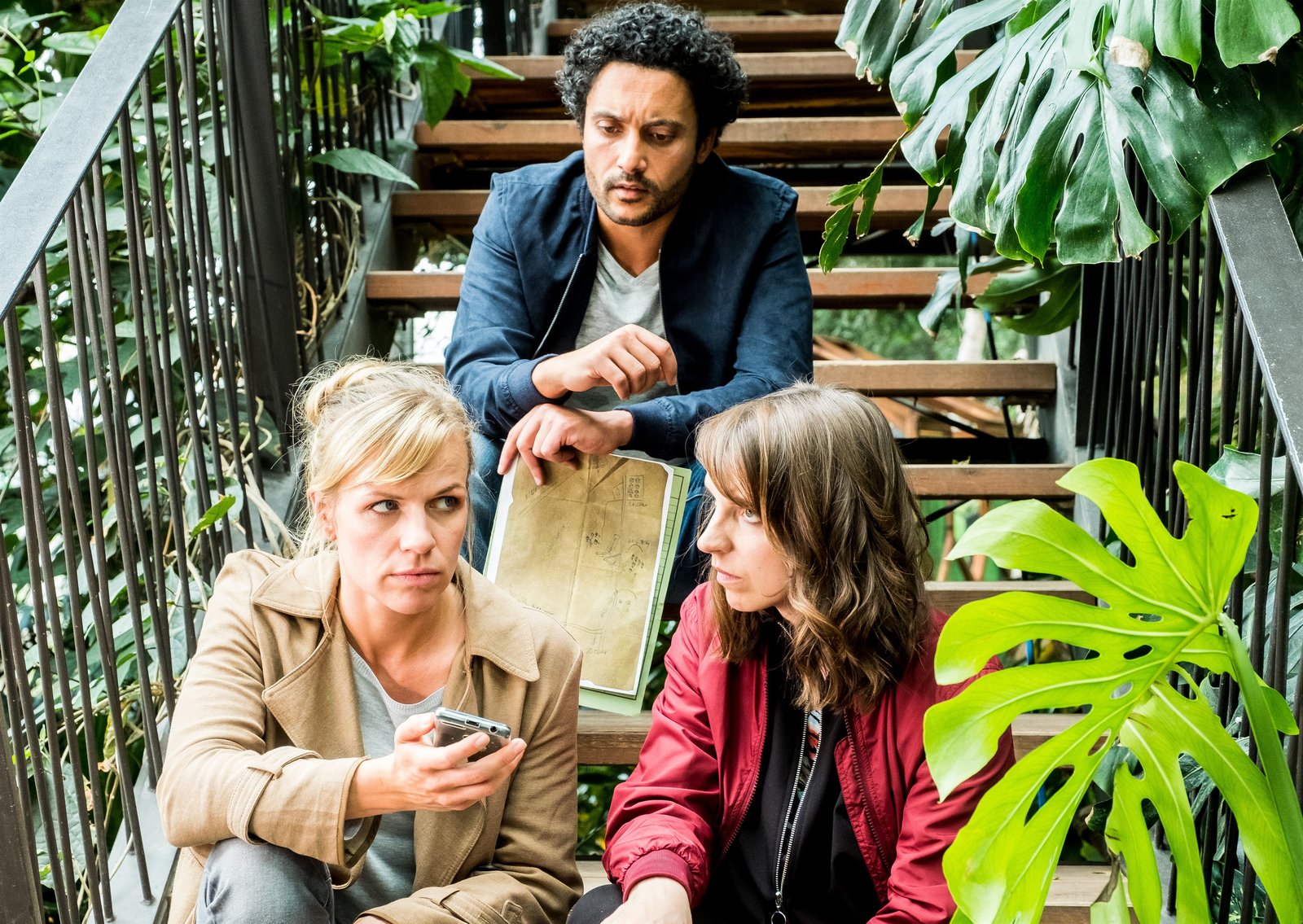 SelbstmordbaumDer tote Gärtner hat eine "Schatzkarte" hinterlassen, die Luna (Caroline Erikson, r.) und Sophie (Katrin Jaehne, l.) auch mit Davids (Omar El-Saeidi, M.) Hilfe nicht entschlüsseln können.Bild: © ZDF und Gordon Muehle.
