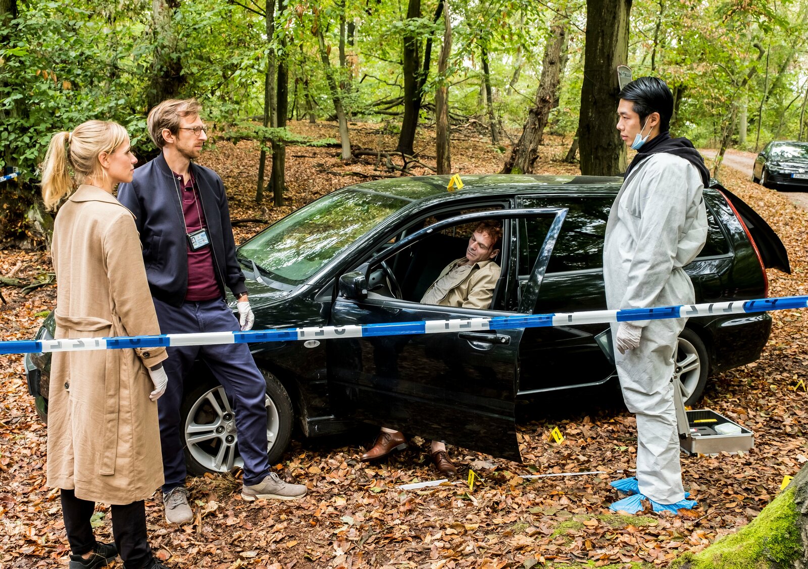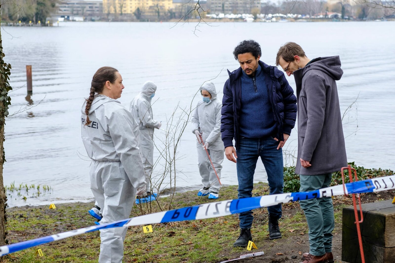 Bittersüßer TodEine junge Frau wird vermisst. Am See findet Spusi Jutta Specht (Gabriele Völsch, l.) das Handy der Vermissten und entdeckt Kampfspuren. Doch was den beiden Kommissaren David Grünbaum (Omar El-Saeidi, M.) und Christoph Westerman (Hendrik von Bültzingslöwen, r.) besonders auffällt: die Spuren eines Fat-Bikes. Im Hintergrund zwei Komparsen in weißen Overalls.Bild: © ZDF und Gordon Muehle.