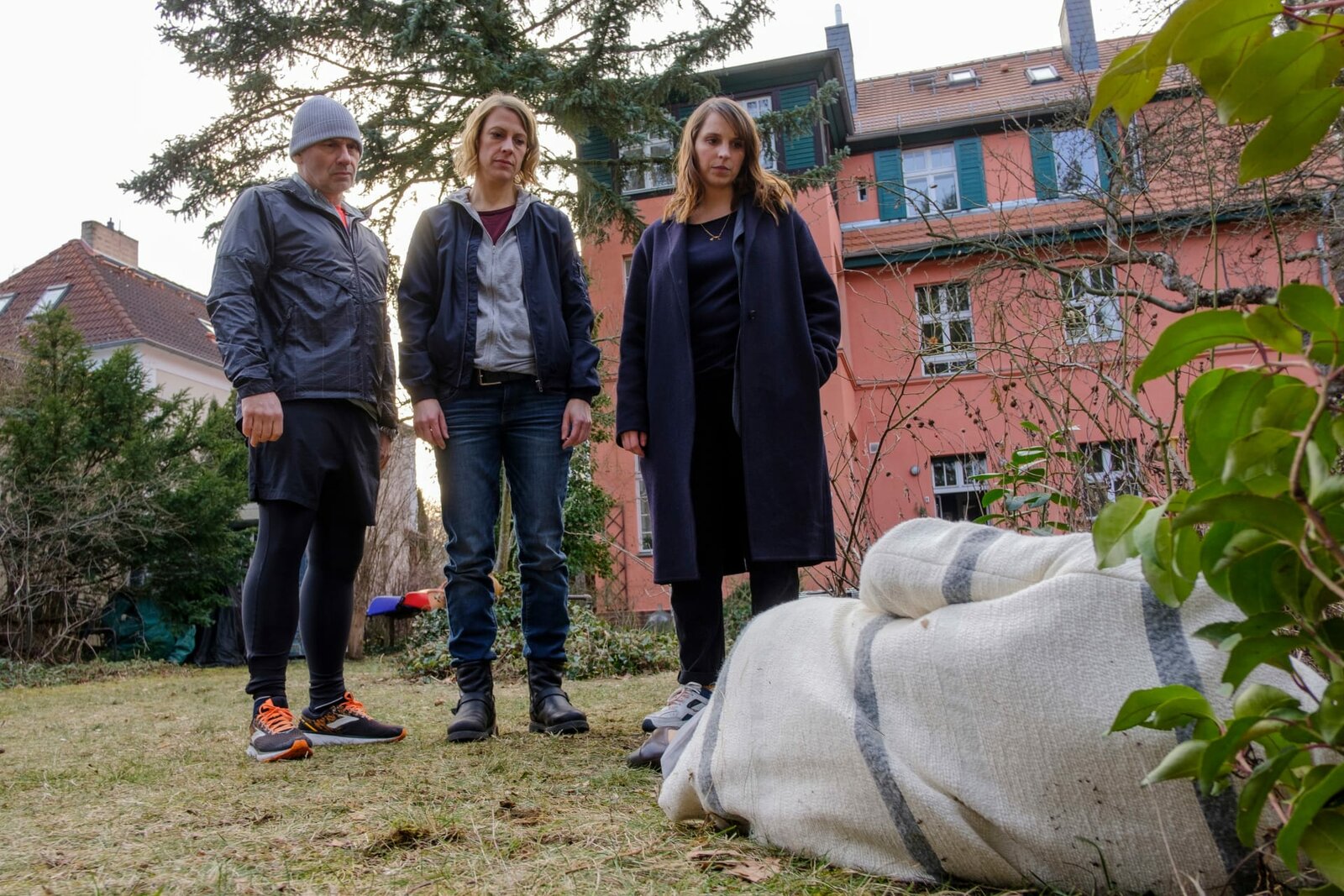 Wenn es dunkel wirdBernhard Henschel (Michael Lott, l.), Tamara Meurer (Anja Pahl, M.) und Luna Kunath (Caroline Erikson, r.) lassen sich Details zum Opfer Ulla Seifert (Komparsin, liegend) geben. Sie wurde im Garten erstochen. Die Tatwaffe fehlt.Bild: © ZDF und Gordon Muehle.