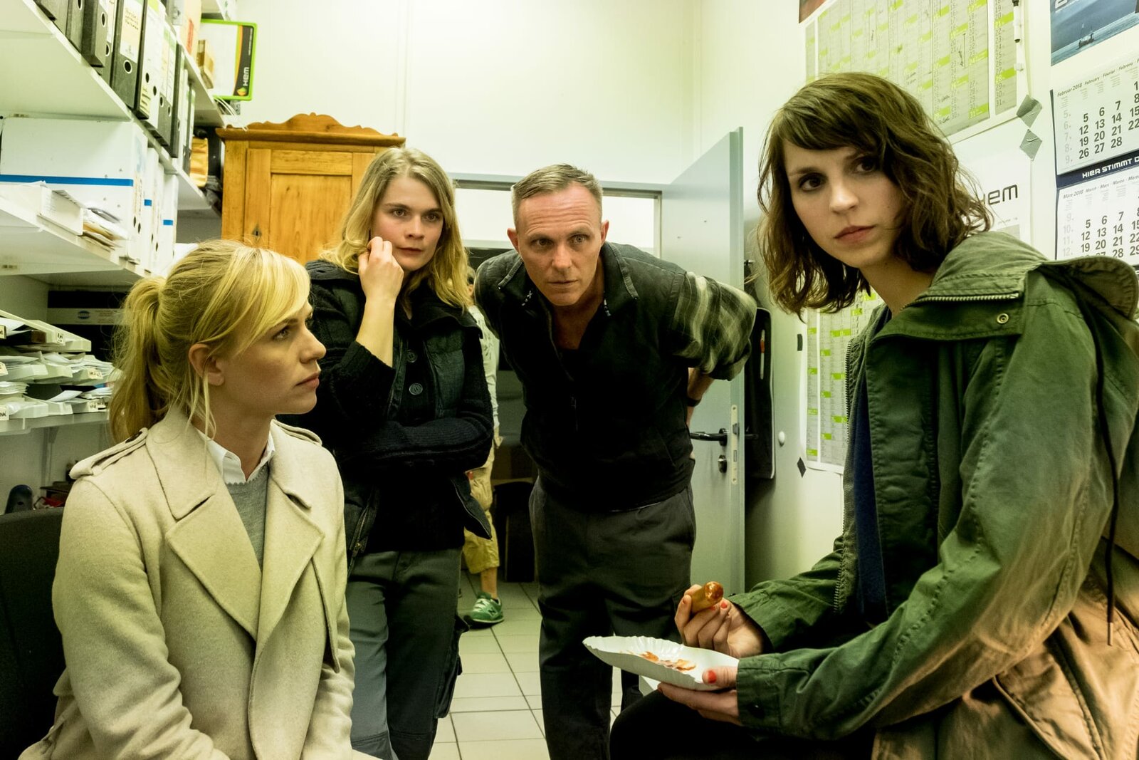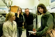 Saubere GeschäfteDie Kommissarinnen Luna Kunath (Caroline Erikson, r.) und Sophie Pohlmann (Katrin Jaehne l.) schauen sich gemeinsam mit dem Tankstellenbesitzer Peter Wendt (Dirk Martens, 2.v.r.) und seiner Mitarbeiterin Anja (Anna Schimrigk, 2.v.l.) die Überwachungsbänder vom Zeitpunkt des Mordes an.Bild: © ZDF und Gordon Muehle.