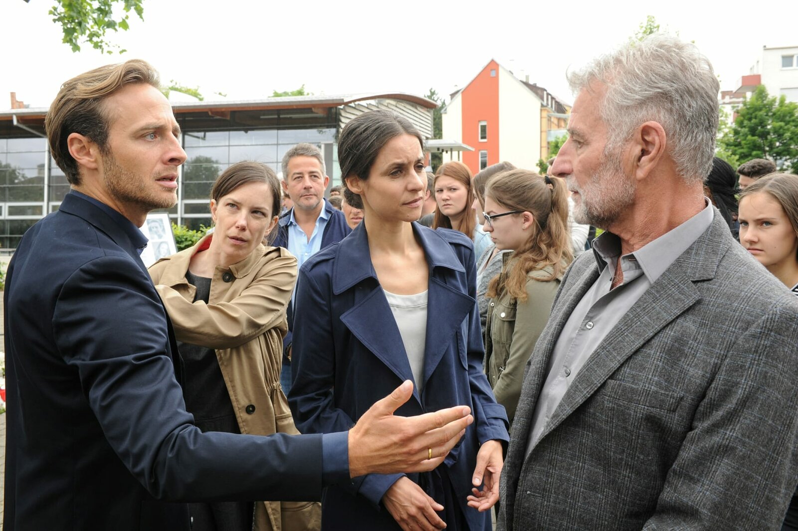 SühneUmringt von trauernden Sch¸lern (Komparsen, Hintergrund r.) und Eltern (Komparsen, Hintergrund l.) regt sich Tobias Mhnle (Gabriel Raab, l.) ¸ber Heiner Grindels (Komparse, r.) Erscheinen bei der Trauerfeier auf. W‰hrend Johanna Lehmann (Anne von Keller, 2.v.l.) versucht, den w¸tenden Mhnle zu beschwichtigen, redet Lilly Falk (Liane Forestieri, 2.v.r.) auf Heiner Grindel ein.Bild: © Sky Krimi