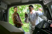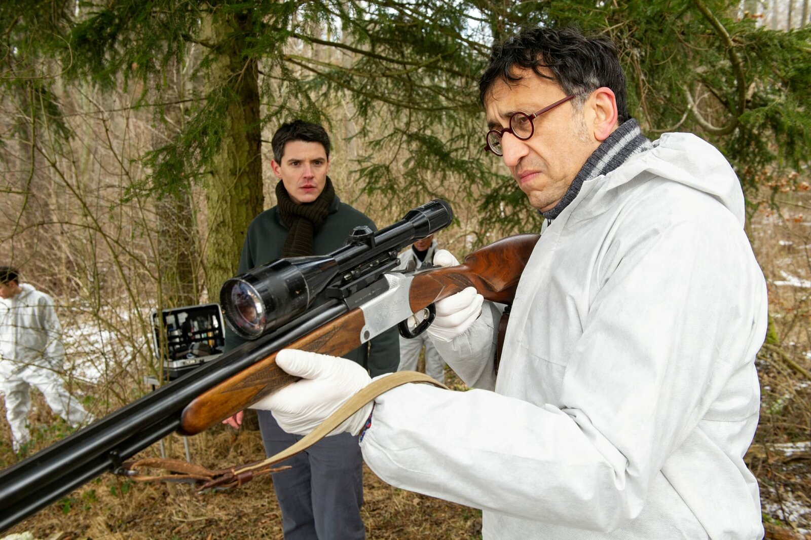 Böser WolfRico Sander (Benjamin Strecker, l.) informiert sich bei Jan Arnaud (Mike Zaka Sommerfeldt, r.) über das Jagdgewehr, das neben dem Opfer gefunden wurde.Bild: © Sky Krimi