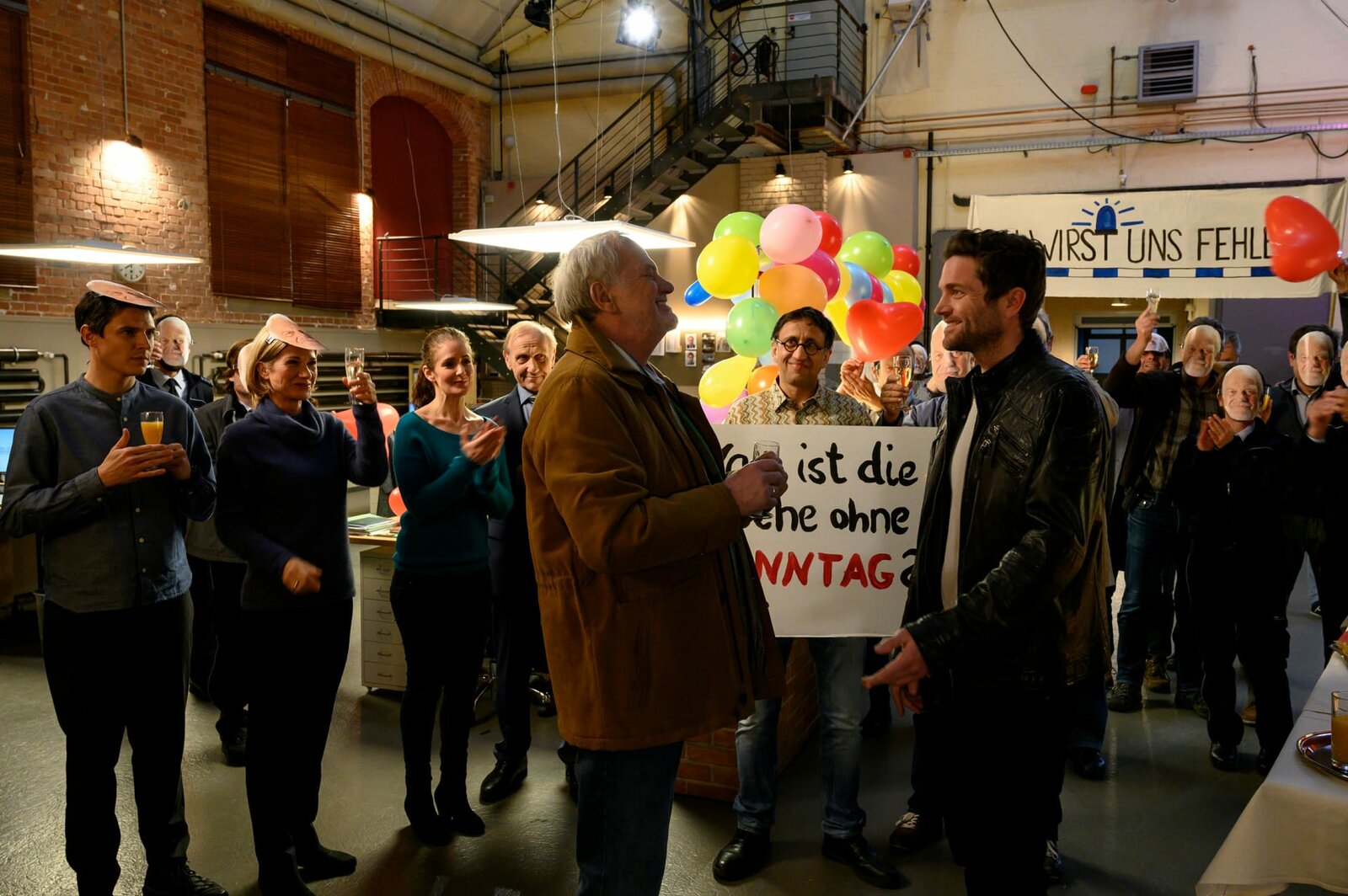 Böser WolfFriedemann Sonntag (Christian Pätzold, mitte l.) wird von seinen Kollegen in den wohlverdienten Ruhestand verabschiedet.Bild: © Sky Krimi