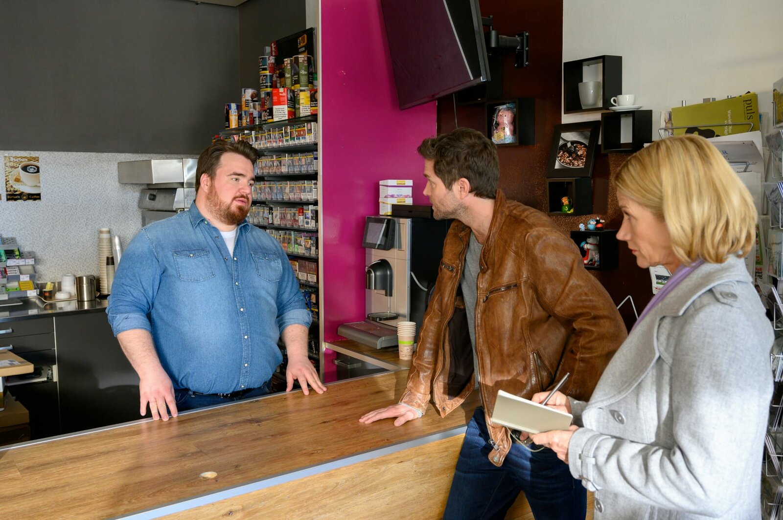Ganz alleinMartina Seiffert (Astrid M. Fünderich, r.) und Jo Stoll (Peter Ketnath, M.) befragen Kiosk-Inhaber Viktor Betz (Tristan Seith, l.) zum Opfer.Bild: © Sky Krimi