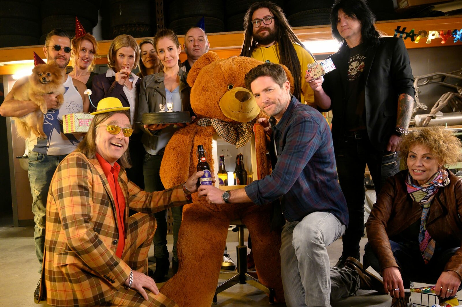 Ganz alleinJo Stoll (Peter Ketnath, r.) überrascht "Schrotti" (Michael Gaedt, l.) mit Selma Kirsch (Yve Burbach), Martina Seiffert (Astrid M. Fünderich, 4.v.l.) und weiteren Freunden von Schrotti zu seinem Geburtstag.Bild: © Sky Krimi
