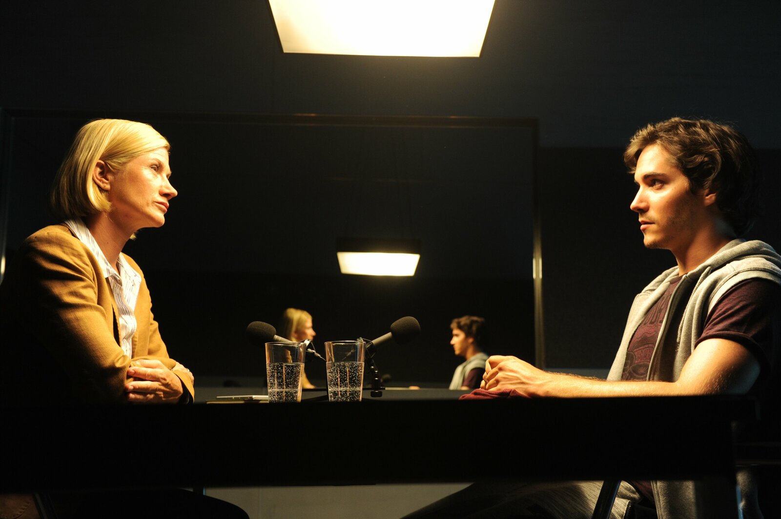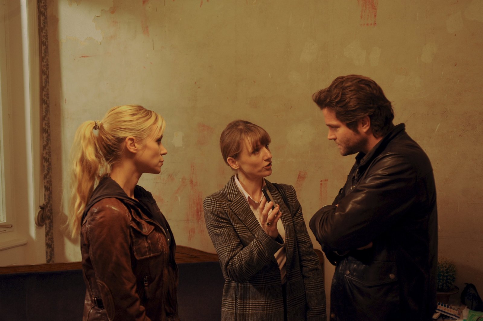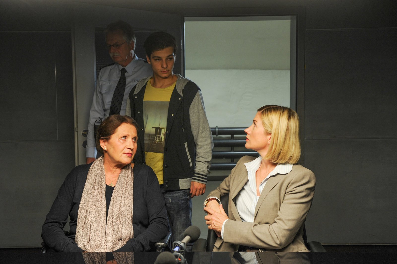 EiskaltDer verdächtige Frank Köster (Niklas Nißl, M.) wird von einem Beamten (Komparse) in den Vernehmungsraum zu Martina Seiffert (Astrid M. Fünderich, r.) geführt. Prof. Lisa Wolter (Eva Maria Bayerwaltes, l.) sitzt mit dabei, da sie die Aussagen des Verdächtigen auf rechtsmedizinische Richtigkeit prüfen soll.Bild: © ZDF und MARKUS-FENCHEL studiofenchel@web