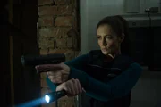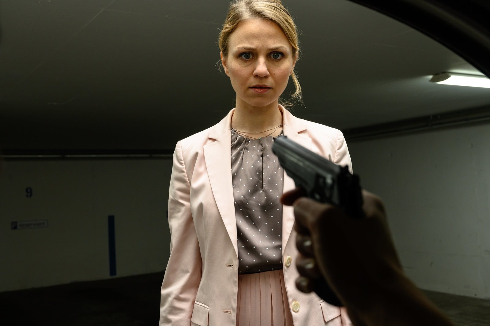 Das Geld anderer LeuteAuf dem Weg zu ihrem Auto wird Larissa Fendler (Teresa Rizos), die Freundin des Opfers, mit einer Waffe bedroht.Bild: © ZDF und Markus Fenchel.