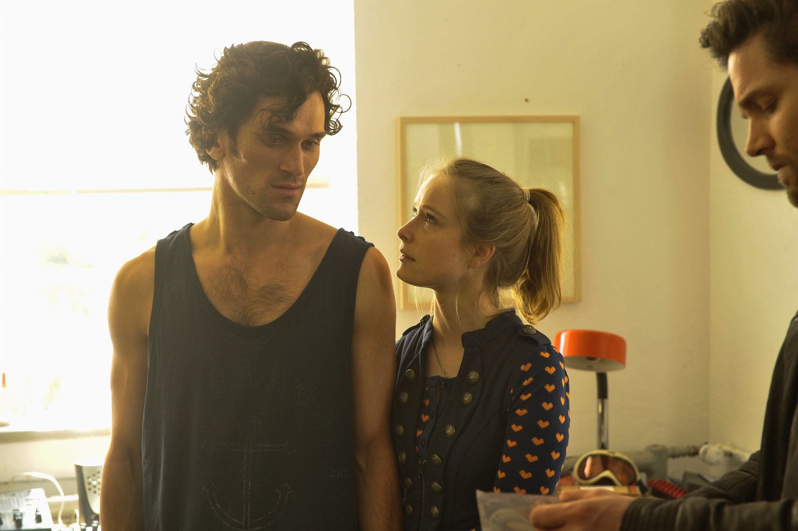 Melodie des TodesNach langer Suche konnte Jo Stoll (Peter Ketnath, r.) endlich den Straßenmusiker ausfindig machen. Dabei handelt es sich um Finn Brückner (Vladimir Korneev, l.), der jetzt befragt werden soll. Seine Freundin Elli Friedrich (Odine Johne, M.) macht sich Sorgen.Bild: © ZDF und MARKUS-FENCHEL studiofenchel@