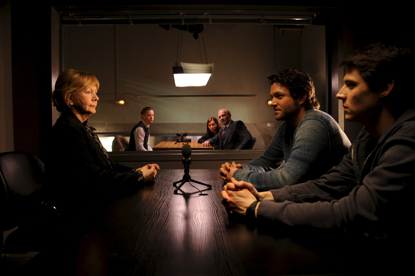 Blutige DiamantenDie Kommissare Rico Sander (Benjamin Strecker, r.), Jo Stoll (Peter Ketnath, 2.v.r.) und Nelly Kienzle (Sylta Fee Wegmann, 3.v.l.) versuchen - mit der Hilfe von Kriminaldirektor Kaiser (Karl Kranzkowski, 3.v.r.) - von der Juweliersgattin (Christine Schorn, l.) und ihrem Sohn (Marek Harloff, 2.v.l.) mehr über deren Familienverhältnisse zu erfahren.Bild: © ZDF und Markus Fenchel