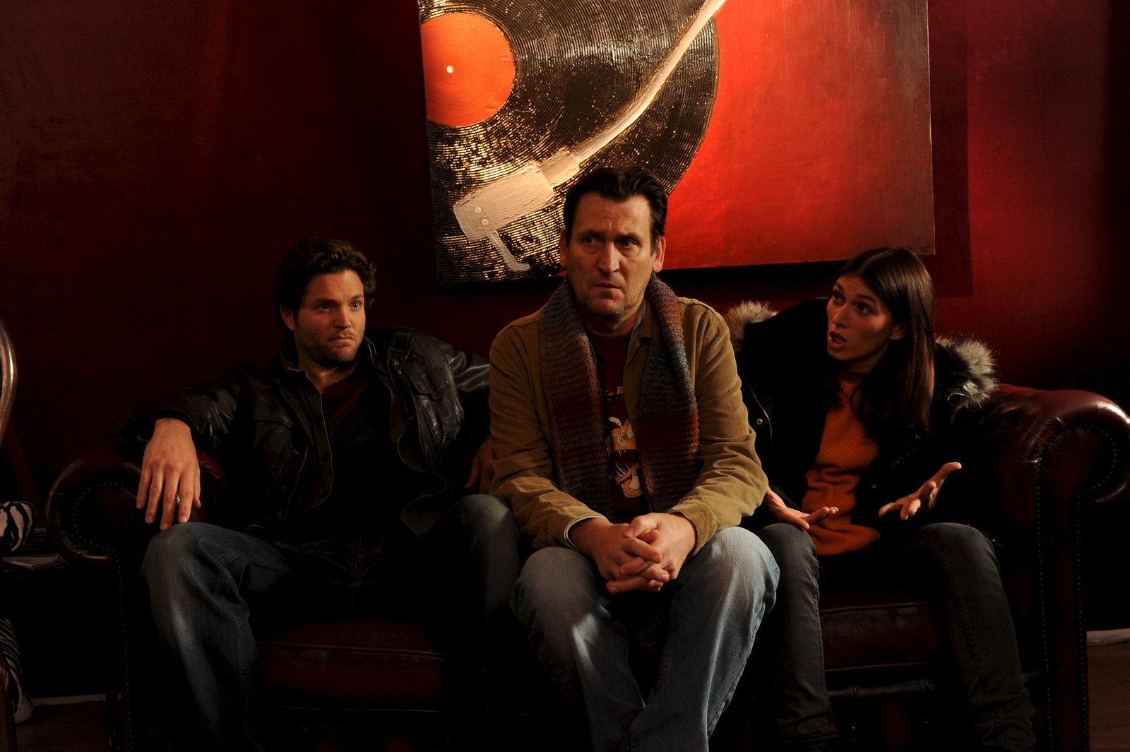 Bis zur letzten RilleDie SOKO-Ermittler Jo Stoll (Peter Ketnath, l.) und Nelly Kienzle (Sylta Fee Wegmann, r.) befragen den Plattenhändler Frank Wolff (Ingo Naujoks, M.). Der hatte zwar Ärger mit dem Opfer, bestreitet aber den Mord.Bild: © ZDF und Markus Fenchel