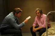 SchattenspielThilo Berger (Hussi Kutlucan, r.) übergibt Kommissar Jo Stoll (Peter Ketnath, l.) einen Beleg aus einer Apotheke, der beweisen soll, dass er zur Tatzeit nicht am Tatort war. Er hatte in der Nacht noch Medizin für seinen kranken Sohn besorgt.Bild: © ZDF und Markus Fenchel